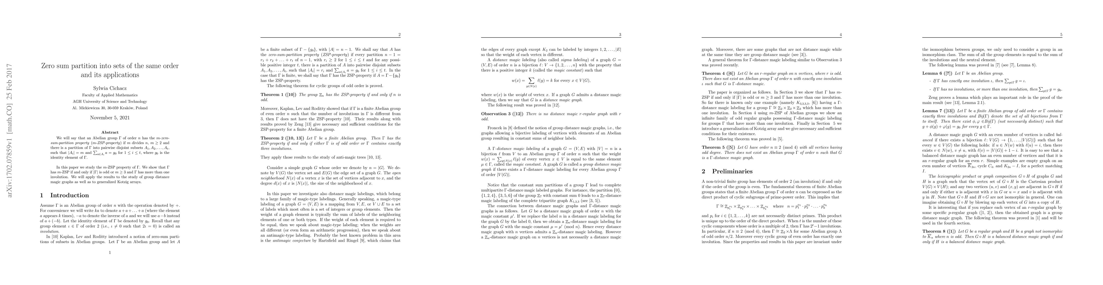 We will say that an Abelian group $\Gamma$ of order $n$ has the $m$-\emph{zero-sum-partition property} ($m$-\textit{ZSP-property}) if $m$ divides $n$, $m\geq 2$ and there is a partition of $\Gamma$ into pairwise disjoint subsets $A_1, A_2,\ldots , A_t$, such that $|A_i| = m$ and $\sum_{a\in A_i}a = g_0$ for $1 \leq i \leq t$, where $g_0$ is the identity element of $\Gamma$. In this paper we study the $m$-ZSP property of $\Gamma$. We show that $\Gamma$ has $m$-ZSP if and only if $|\Gamma|$ is odd or $m\geq 3$ and $\Gamma$ has more than one involution. We will apply the results to the study of group distance magic graphs as well as to generalized Kotzig arrays.