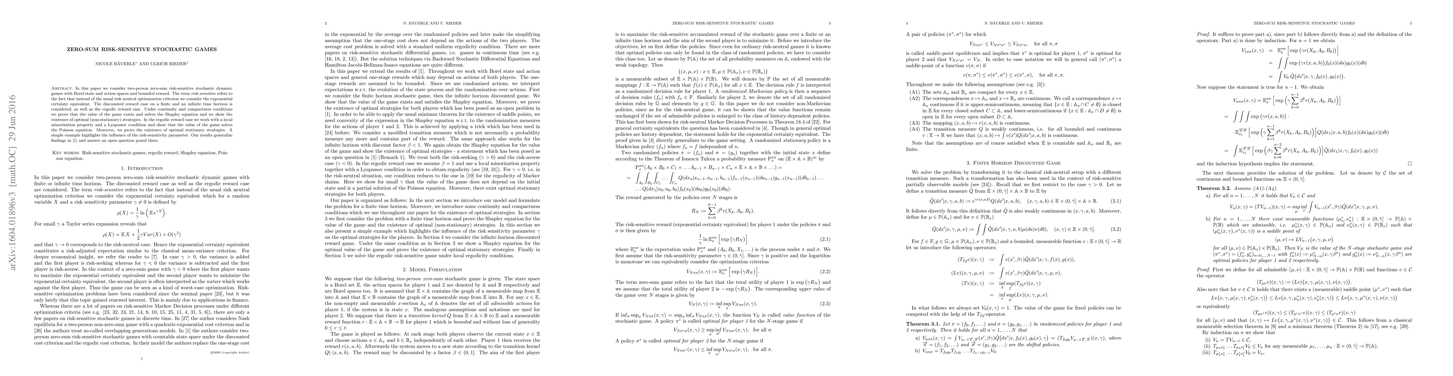 This paper studies two-person zero-sum risk-sensitive stochastic games, employing the exponential certainty equivalent instead of risk-neutral optimization. It proves the existence of game values and optimal strategies under various reward structures, generalizing prior work and addressing an open question.