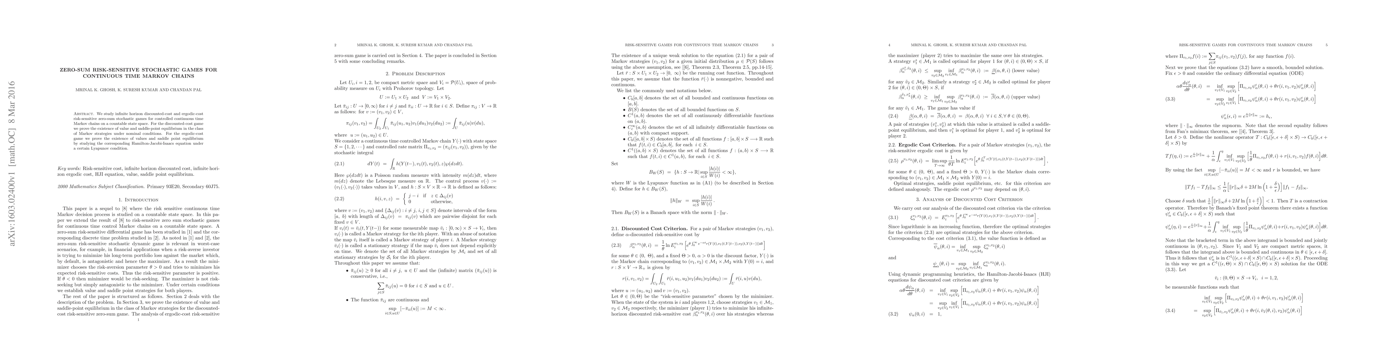 This paper investigates risk-sensitive zero-sum stochastic games for continuous time Markov chains, proving the existence of value and saddle-point equilibrium for both discounted-cost and ergodic-cost games, using Markov strategies and Hamilton-Jacobi-Isaacs equations under nominal and Lyapunov conditions.