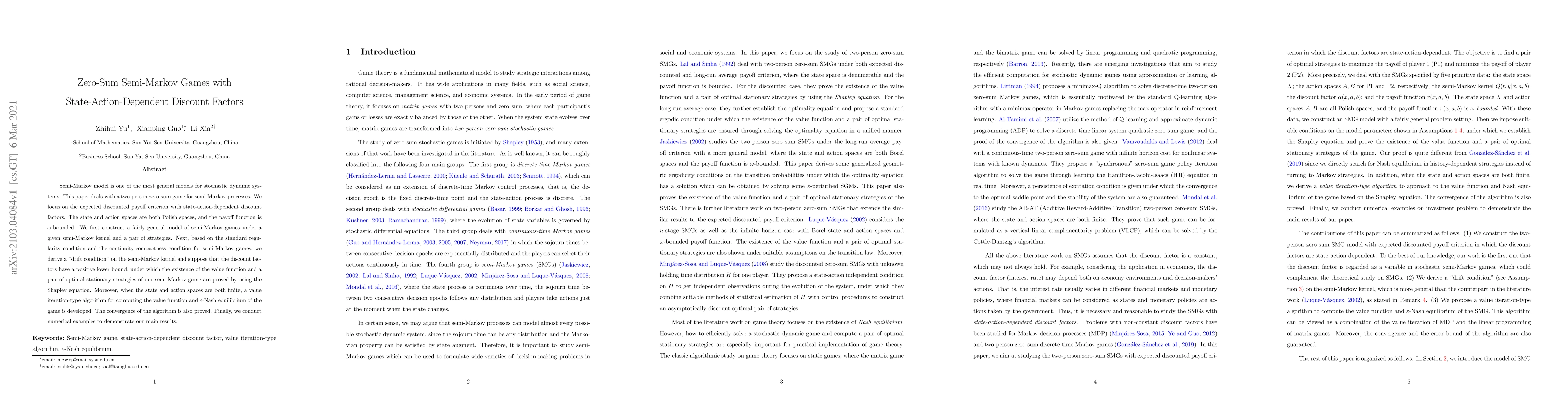 This paper studies zero-sum semi-Markov games with state-action-dependent discount factors, proving the existence of a value function and optimal strategies under certain conditions. A value iteration algorithm is developed for finite state and action spaces, with proven convergence, and numerical examples are provided to validate the results.