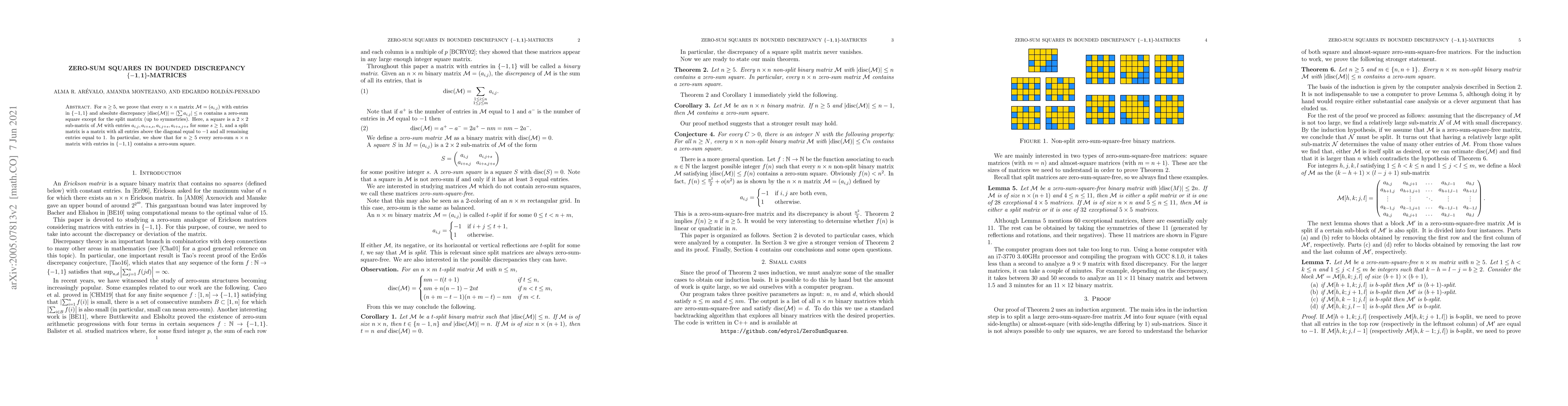 For $n\ge 5$, we prove that every $n\times n$ matrix $M=(a_{i,j})$ with entries in $\{-1,1\}$ and absolute discrepancy $|\mathrm{disc}(M)|=|\sum a_{i,j}|\le n$ contains a zero-sum square except for the split matrix (up to symmetries). Here, a square is a $2\times 2$ sub-matrix of $M$ with entries $a_{i,j}, a_{i+s,s}, a_{i,j+s}, a_{i+s,j+s}$ for some $s\ge 1$, and a split matrix is a matrix with all entries above the diagonal equal to $-1$ and all remaining entries equal to $1$. In particular, we show that for $n\ge 5$ every zero-sum $n\times n$ matrix with entries in $\{-1,1\}$ contains a zero-sum square.