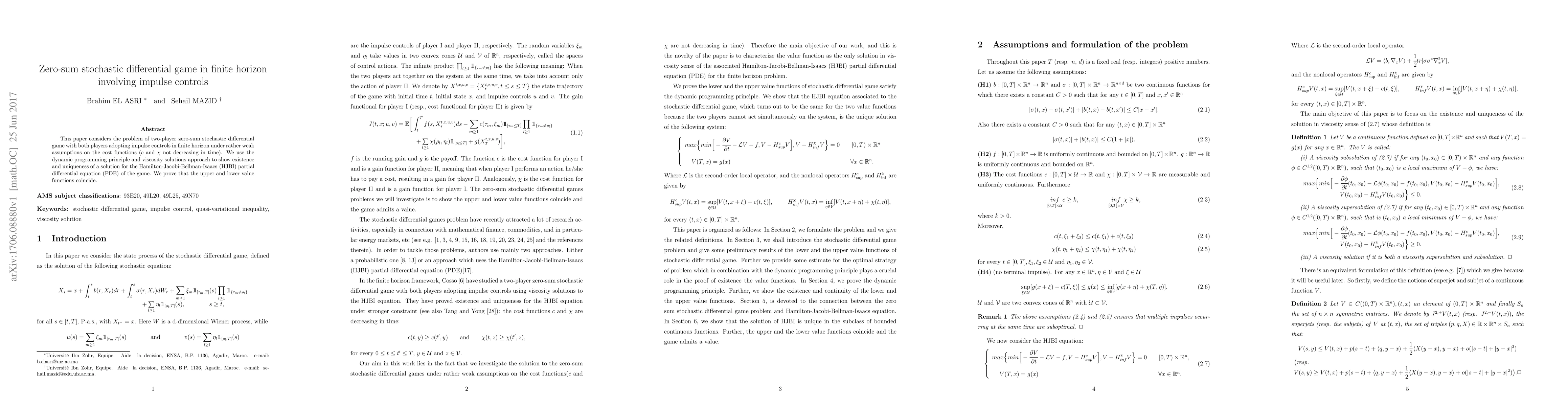 This paper addresses a two-player zero-sum stochastic differential game with impulse controls in a finite horizon, proving the existence and uniqueness of a solution to the Hamilton-Jacobi-Bellman-Isaacs PDE using dynamic programming and viscosity solutions, and showing that the upper and lower value functions are identical.