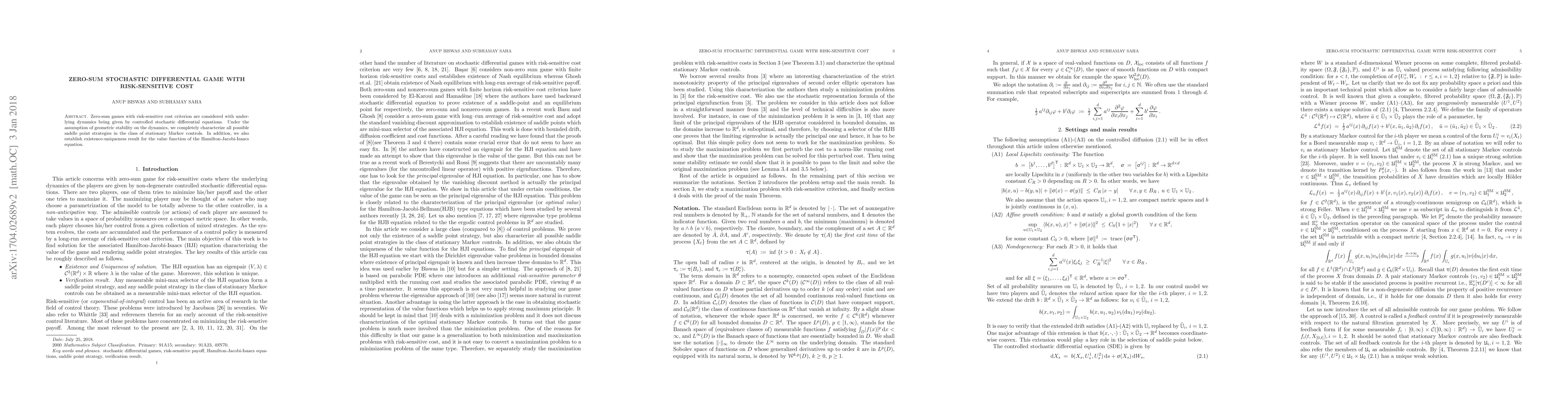 Researchers studied zero-sum games with risk-sensitive cost, finding that they can completely characterize saddle point strategies for stationary Markov controls under geometric stability assumptions. They also established existence-uniqueness results for the value function of the Hamilton-Jacobi-Isaacs equation.