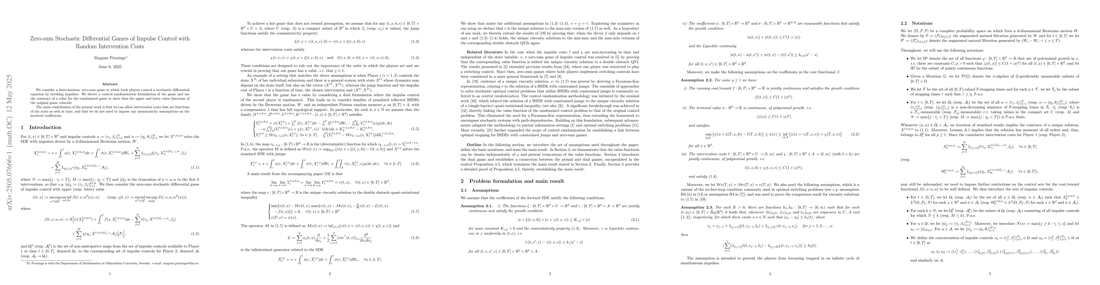 Researchers developed a game theory framework for impulse control with random intervention costs, showing that upper and lower value functions coincide in zero-sum games.