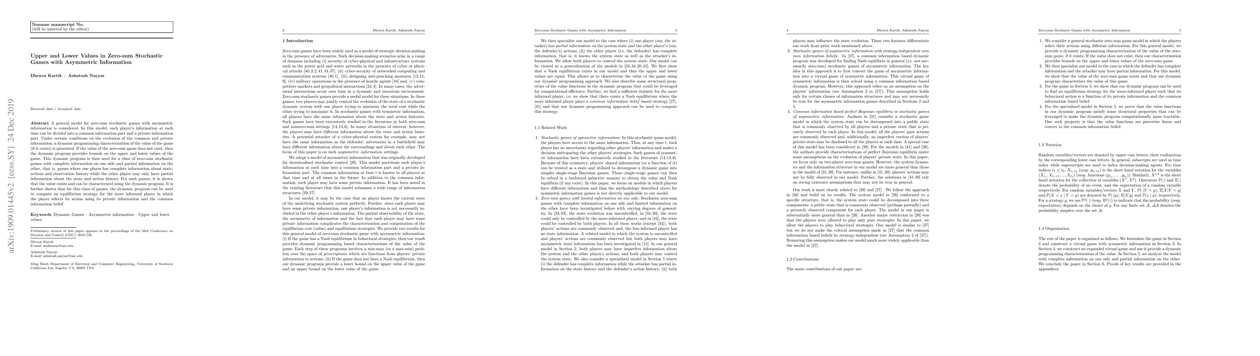 This paper explores zero-sum stochastic games with asymmetric information, presenting a dynamic programming framework to characterize the game's value when it exists or provide bounds otherwise. It applies this framework to games where one player has full information while the other has partial information, demonstrating the existence and computation of equilibrium strategies.