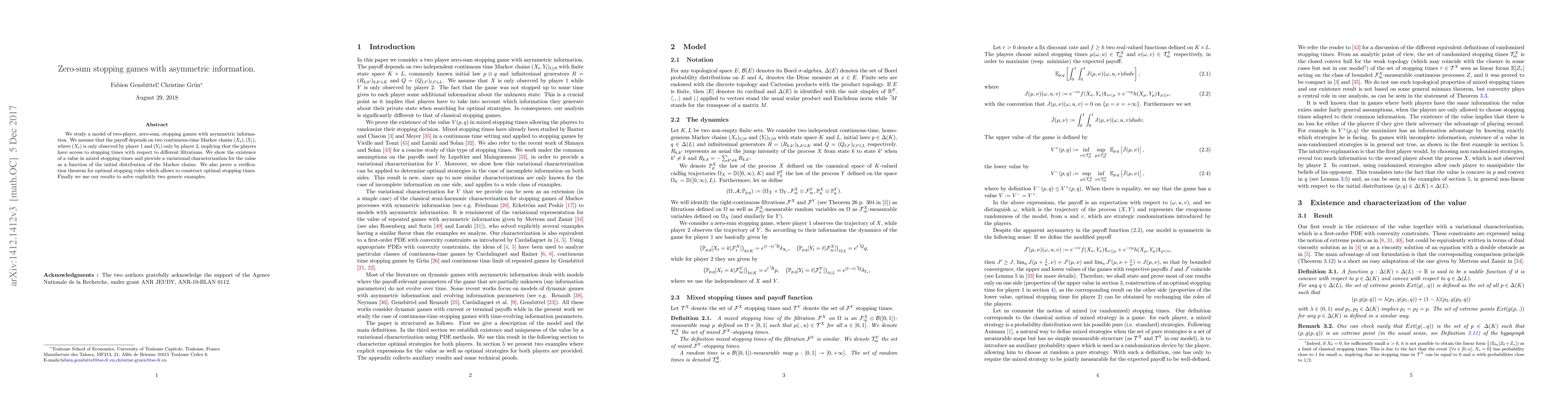 This paper explores zero-sum stopping games with asymmetric information using continuous-time Markov chains. It demonstrates the existence of a value in mixed stopping times and provides a variational characterization of this value based on initial distributions. It also proves a verification theorem for optimal stopping rules and solves two specific examples explicitly.