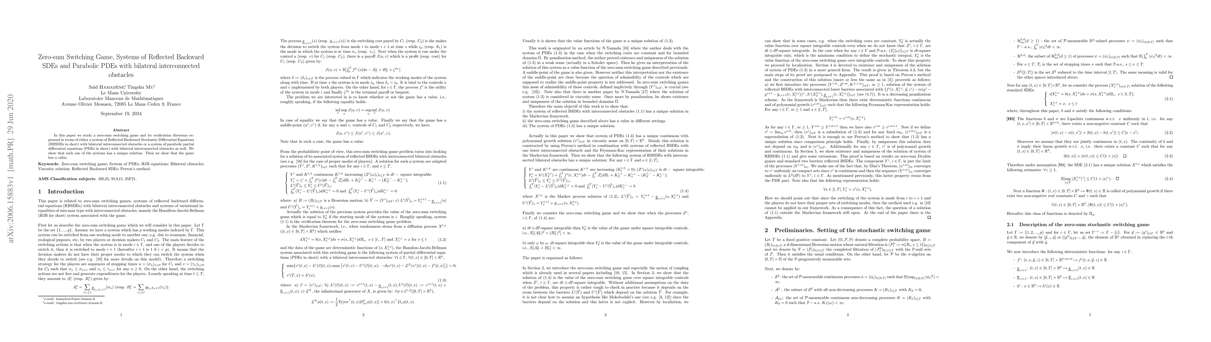 This paper investigates a zero-sum switching game, proving the existence of unique solutions for systems of reflected backward SDEs and parabolic PDEs with bilateral interconnected obstacles. It also establishes the game's value through these systems.