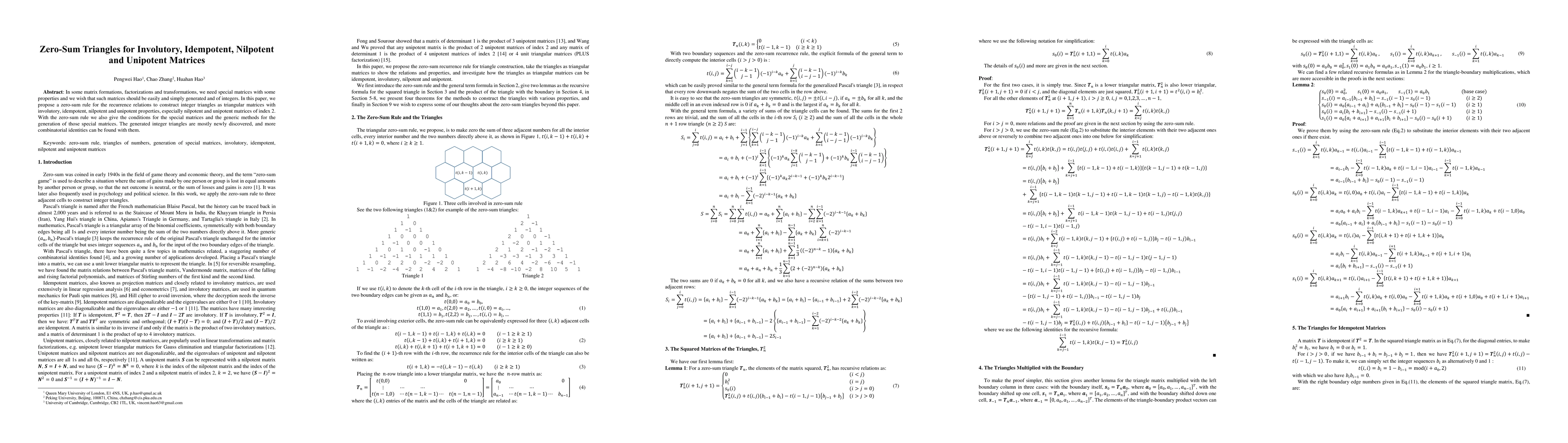This paper proposes a zero-sum rule for constructing integer triangular matrices with involutory, idempotent, nilpotent, and unipotent properties, focusing on nilpotent and unipotent matrices of index 2. It provides conditions and methods for generating these special matrices, revealing new combinatorial identities.