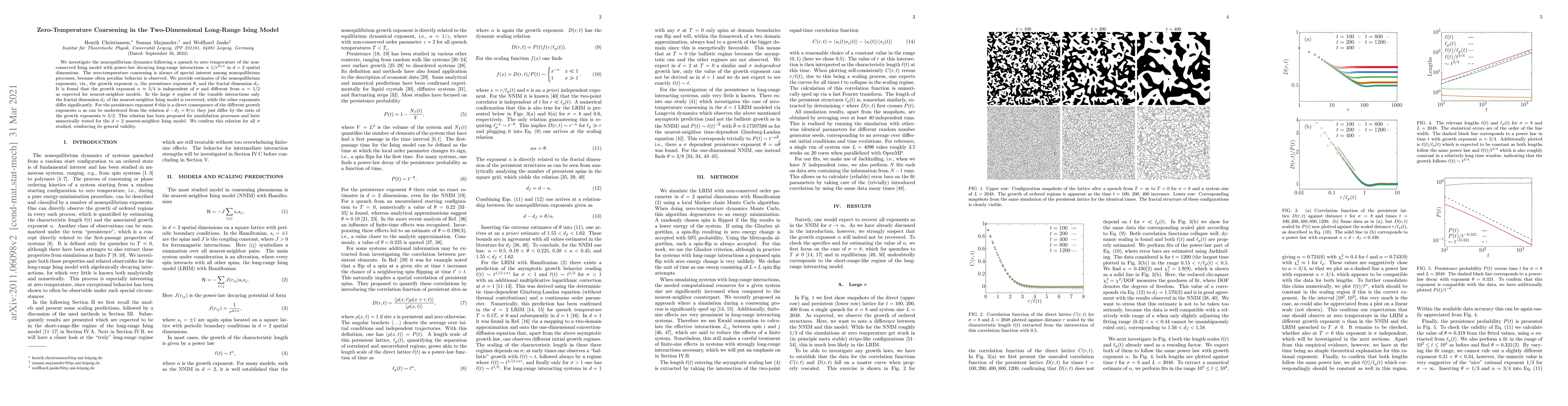 This paper studies the zero-temperature coarsening dynamics in a two-dimensional long-range Ising model with power-law interactions. It finds that the growth exponent $\alpha \approx 3/4$ is independent of $\sigma$ and differs from $\alpha=1/2$ in nearest-neighbor models, while confirming the relation $d-d_f=\theta/\alpha$ for all $\sigma$.