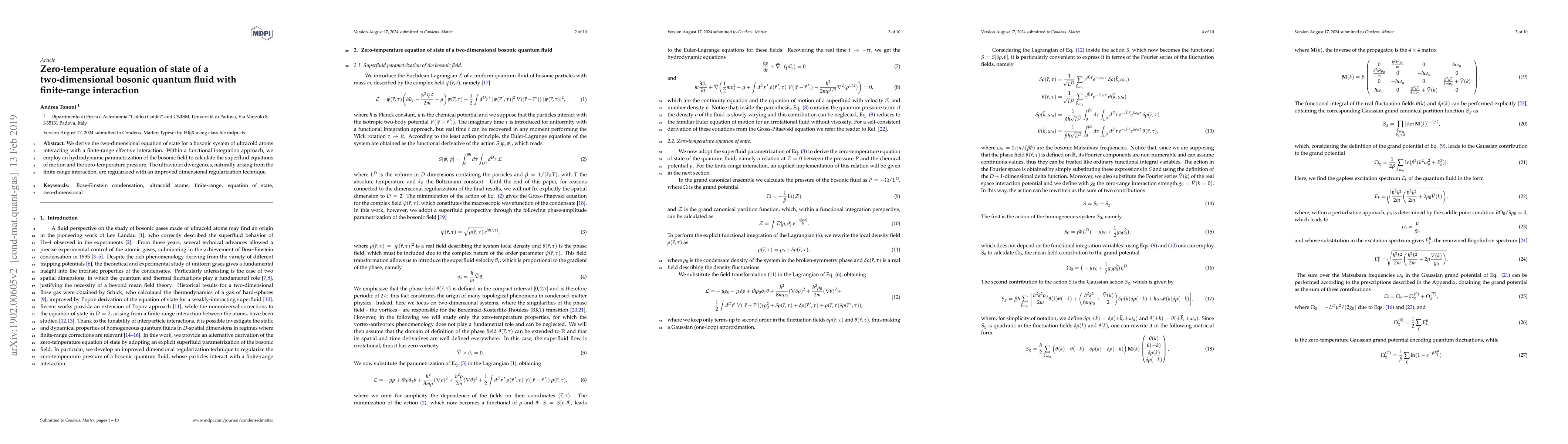 We derive the two-dimensional equation of state for a bosonic system of ultracold atoms interacting with a finite-range effective interaction. Within a functional integration approach, we employ an hydrodynamic parametrization of the bosonic field to calculate the superfluid equations of motion and the zero-temperature pressure. The ultraviolet divergences, naturally arising from the finite-range interaction, are regularized with an improved dimensional regularization technique.