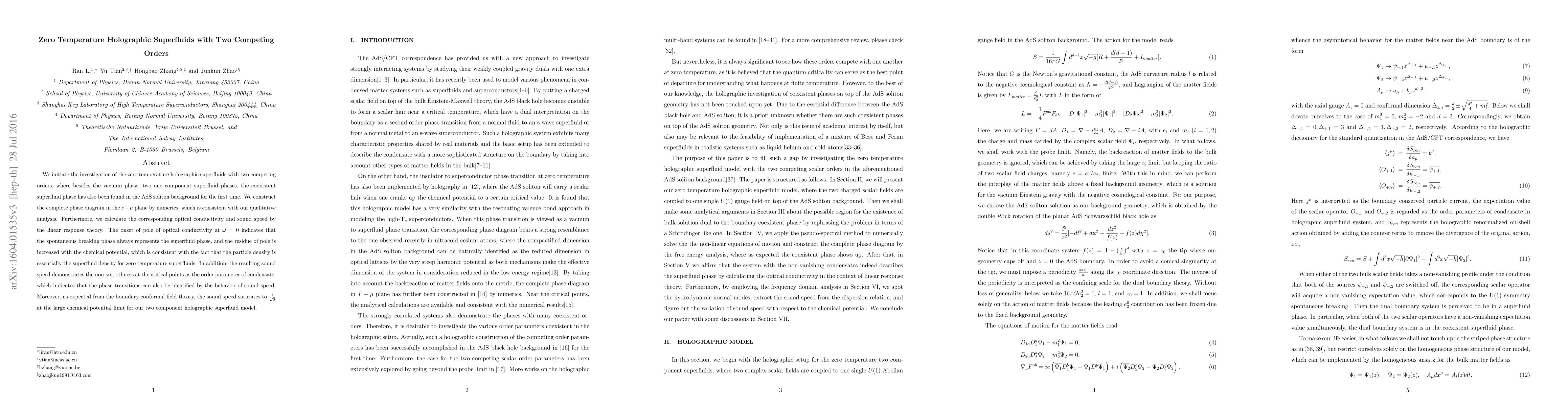 This paper explores zero temperature holographic superfluids with two competing orders in an AdS soliton background, identifying three distinct phases including a coexistent superfluid phase. The study reveals a complete phase diagram and calculates optical conductivity and sound speed, showing non-smooth transitions and saturation of sound speed to $\frac{1}{\sqrt{2}}$ at high chemical potential.