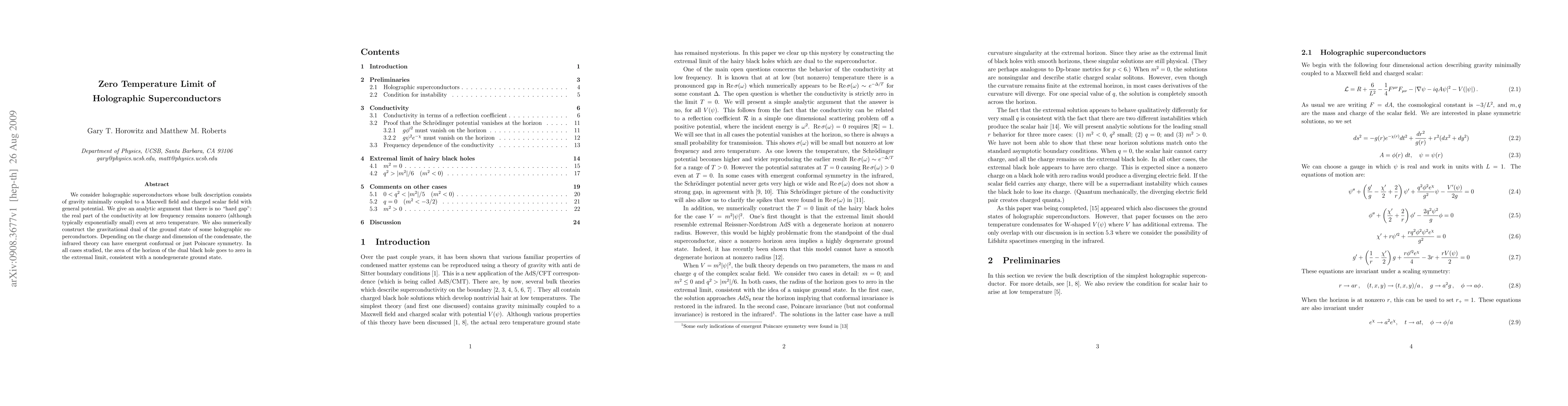 This paper investigates holographic superconductors, showing analytically that they lack a "hard gap" and have a nonzero conductivity at low frequencies even at zero temperature. Numerically constructed gravitational duals reveal that the ground state's symmetry depends on the condensate's charge and dimension, and the horizon area vanishes in the extremal limit, indicating a nondegenerate ground state.