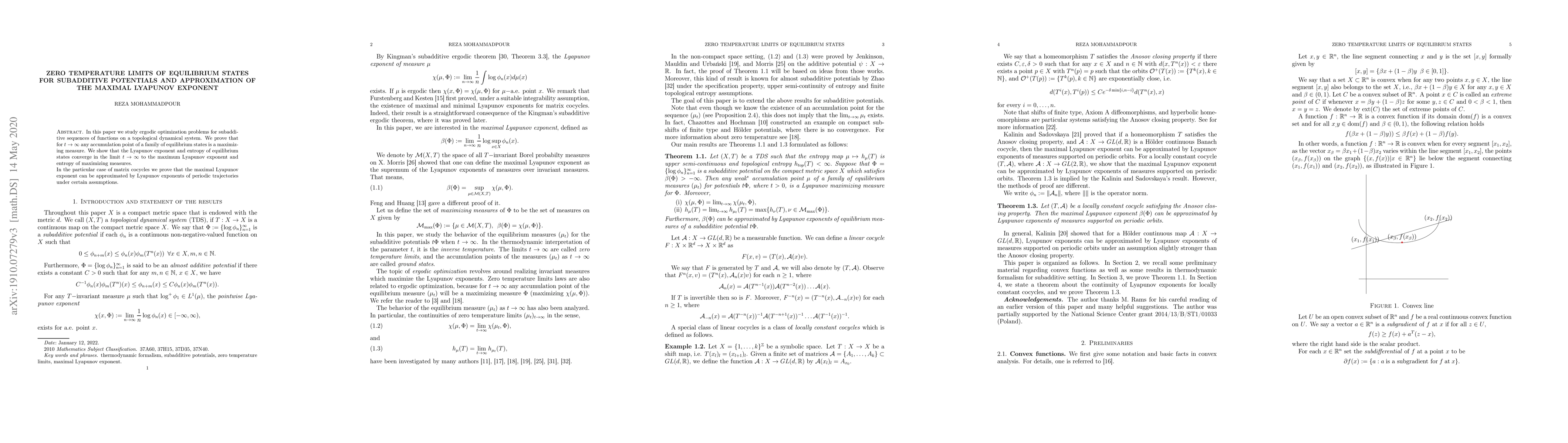In this paper we study ergodic optimization problems for subadditive sequences of functions on a topological dynamical system. We prove that for $t\rightarrow \infty$ any accumulation point of a family of equilibrium states is a maximizing measure. We show that the Lyapunov exponent and entropy of equilibrium states converge in the limit $t\rightarrow \infty$ to the maximum Lyapunov exponent and entropy of maximizing measures. In the particular case of matrix cocycles we prove that the maximal Lyapunov exponent can be approximated by Lyapunov exponents of periodic trajectories under certain assumptions.