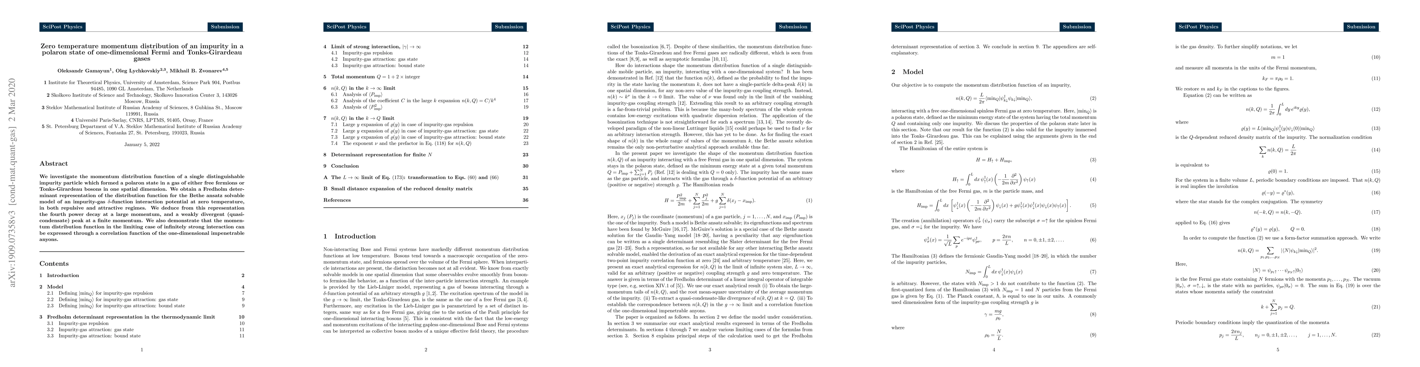 We investigate the momentum distribution function of a single distinguishable impurity particle which formed a polaron state in a gas of either free fermions or Tonks-Girardeau bosons in one spatial dimension. We obtain a Fredholm determinant representation of the distribution function for the Bethe ansatz solvable model of an impurity-gas $\delta$-function interaction potential at zero temperature, in both repulsive and attractive regimes. We deduce from this representation the fourth power decay at a large momentum, and a weakly divergent (quasi-condensate) peak at a finite momentum. We also demonstrate that the momentum distribution function in the limiting case of infinitely strong interaction can be expressed through a correlation function of the one-dimensional impenetrable anyons.