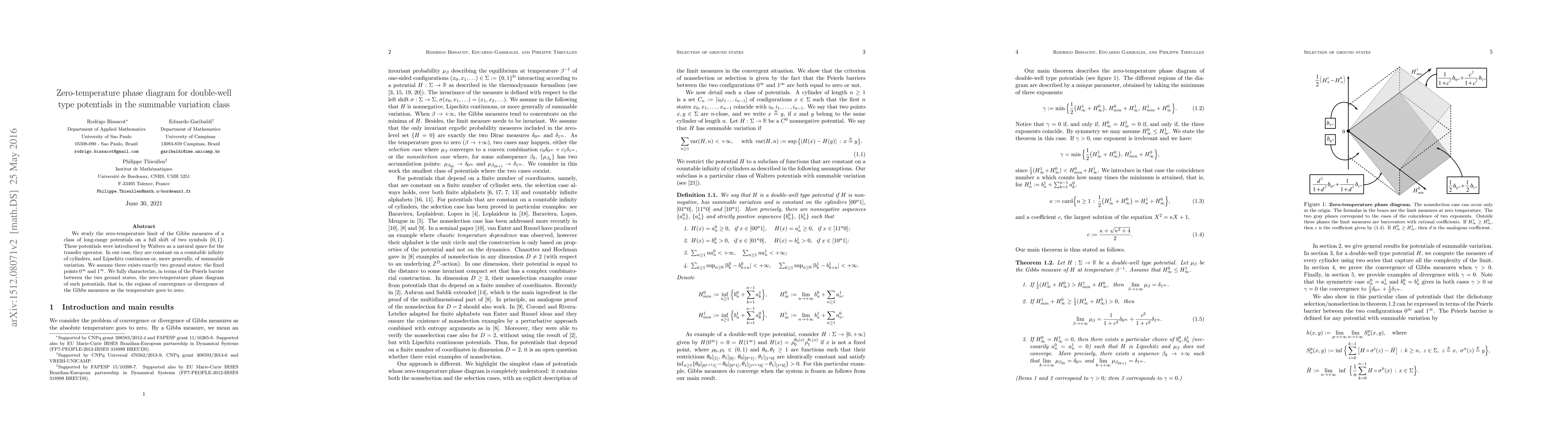 We study the zero-temperature limit of the Gibbs measures of a class of long-range potentials on a full shift of two symbols $\{0,1\}$. These potentials were introduced by Walters as a natural space for the transfer operator. In our case, they are locally constant, Lipschitz continuous or, more generally, of summable variation. We assume there exists exactly two ground states: the fixed points $0^\infty$ and $1^\infty$. We fully characterize, in terms of the Peierls barrier between the two ground states, the zero-temperature phase diagram of such potentials, that is, the regions of convergence or divergence of the Gibbs measures as the temperature goes to zero.