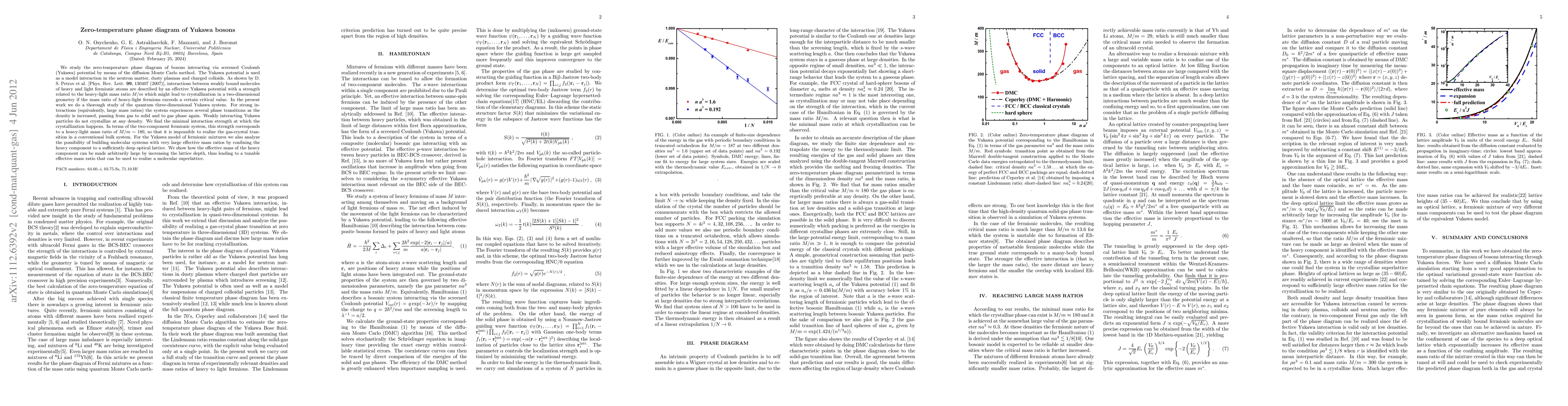 We study the zero-temperature phase diagram of bosons interacting via screened Coulomb (Yukawa) potential by means of the diffusion Monte Carlo method. The Yukawa potential is used as a model interaction in the neutron matter, dusty plasmas and charged colloids. As shown by D. S. Petrov et al. [Phys. Rev. Lett. 99, 130407 (2007)], interactions between weakly bound molecules of heavy and light fermionic atoms are described by an effective Yukawa potential with a strength related to the heavy-light mass ratio M/m which might lead to crystallization in a two-dimensional geometry if the mass ratio of heavy-light fermions exceeds a certain critical value. In the present work we do a thorough study of the quantum three-dimensional Yukawa system. For strong interactions (equivalently, large mass ratios) the system experiences several phase transitions as the density is increased, passing from gas to solid and to gas phase again. Weakly interacting Yukawa particles do not crystallize at any density. We find the minimal interaction strength at which the crystallization happens. In terms of the two-component fermionic system, this strength corresponds to a heavy-light mass ratio of M/m ~ 180, so that it is impossible to realize the gas-crystal transition in a conventional bulk system. For the Yukawa model of fermionic mixtures we also analyze the possibility of building molecular systems with very large effective mass ratios by confining the heavy component to a sufficiently deep optical lattice. We show how the effective mass of the heavy component can be made arbitrarily large by increasing the lattice depth, thus leading to a tunable effective mass ratio that can be used to realize a molecular superlattice.