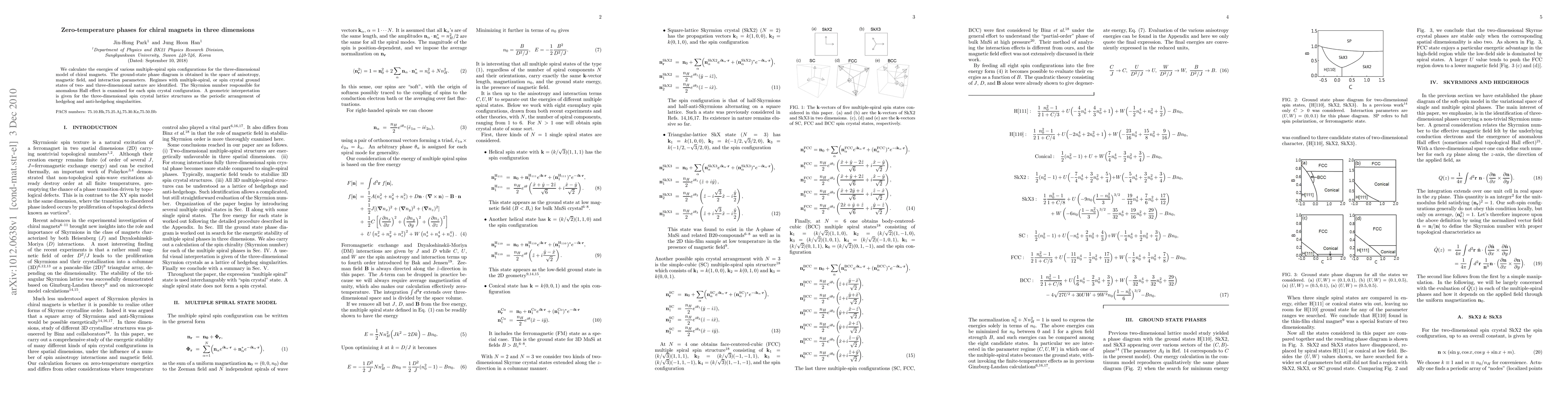 We calculate the energies of various multiple-spiral spin configurations for the three-dimensional model of chiral magnets. The ground-state phase diagram is obtained in the space of anisotropy, magnetic field, and interaction parameters. Regimes with multiple-spiral, or spin crystal ground states of two- and three-dimensional nature are identified. The Skyrmion number responsible for anomalous Hall effect is examined for each spin crystal configuration. A geometric interpretation is given for the three-dimensional spin crystal lattice structures as the periodic arrangement of hedgehog and anti-hedgehog singularities.