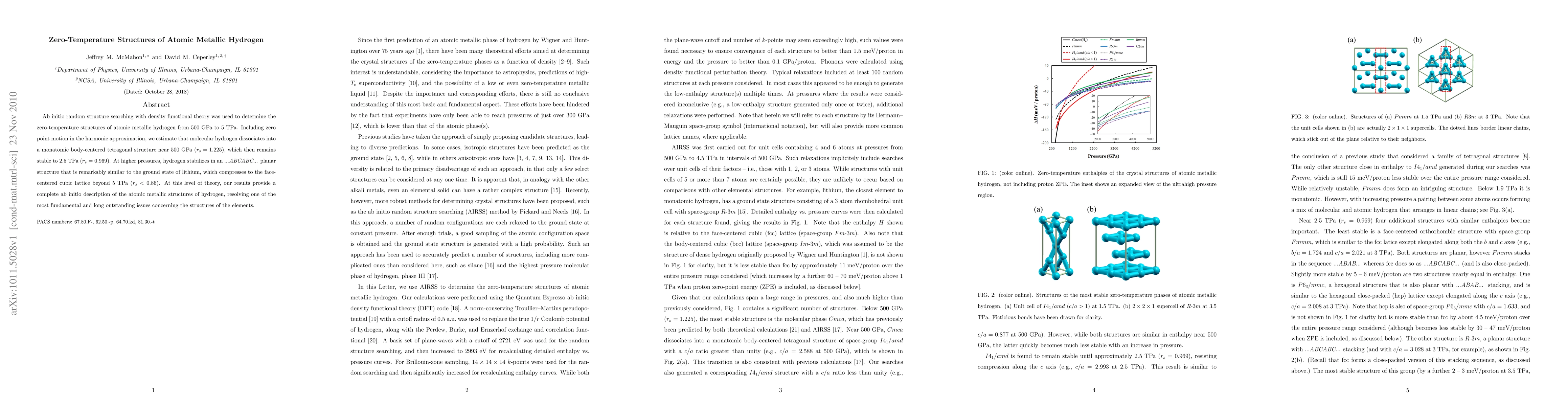 This paper uses ab initio random structure searching and density functional theory to identify zero-temperature structures of atomic metallic hydrogen under extreme pressures, finding a monatomic body-centered tetragonal structure stable from 500 GPa to 2.5 TPa, followed by a planar ABCABC structure resembling lithium's ground state.