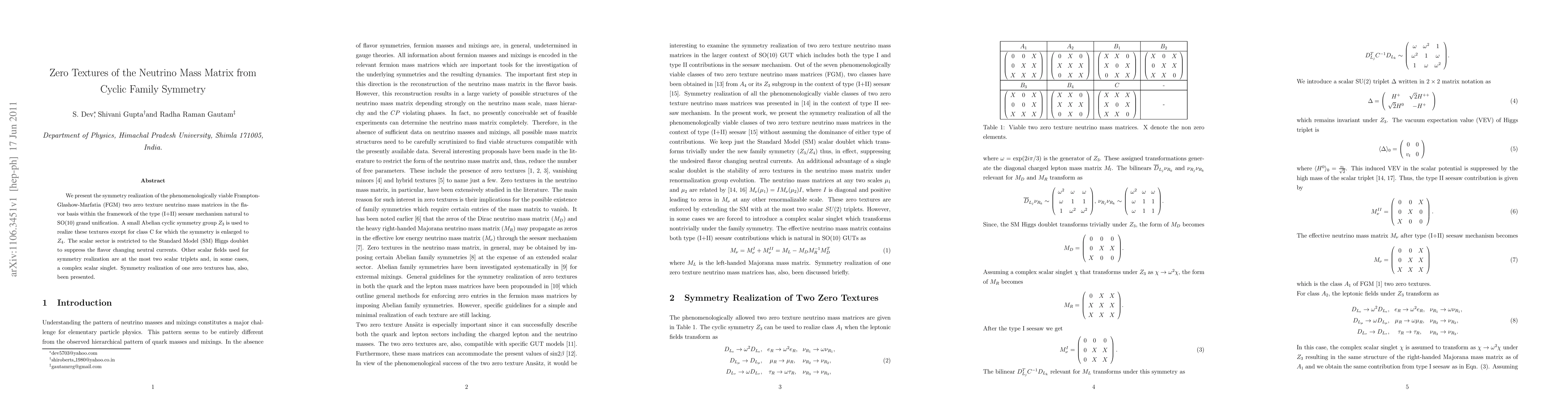 This paper explores the symmetry realization of Frampton-Glashow-Marfatia (FGM) neutrino mass matrices using a cyclic family symmetry within the SO(10) grand unification framework, employing a small Abelian group $Z_3$ (or $Z_4$ for class C) to achieve zero texture structures. The scalar sector is limited to the Standard Model Higgs doublet to minimize flavor-changing neutral currents.