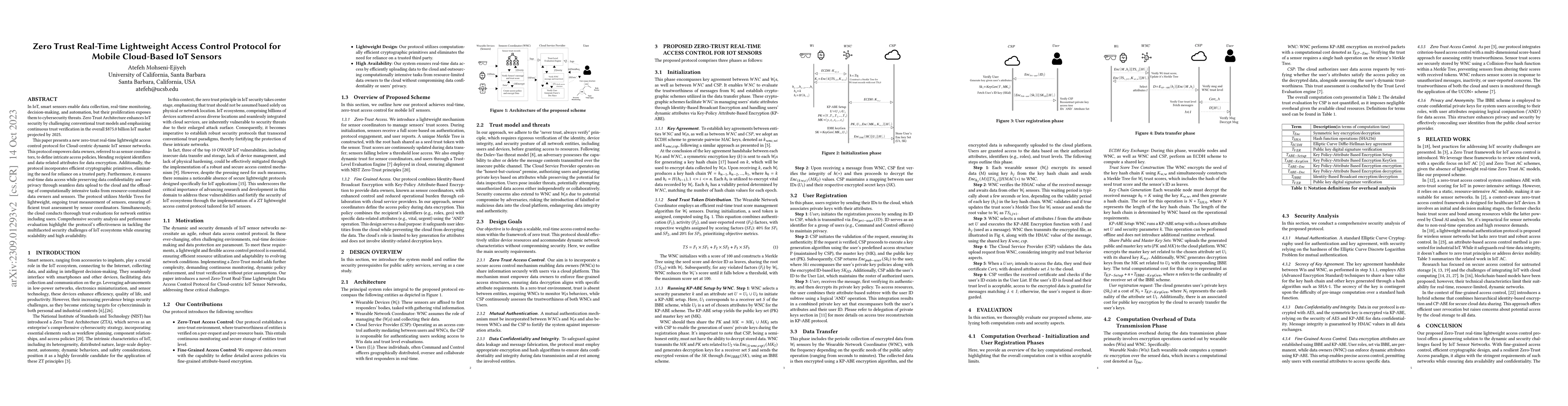 This paper introduces a zero-trust real-time lightweight access control protocol for mobile cloud-based IoT sensors, enabling data owners to define complex access policies and ensuring data confidentiality and privacy through efficient cryptographic methods and trust measurement via Merkle Trees. The protocol enhances IoT security by eliminating reliance on trusted parties and supports real-time data access and scalability.