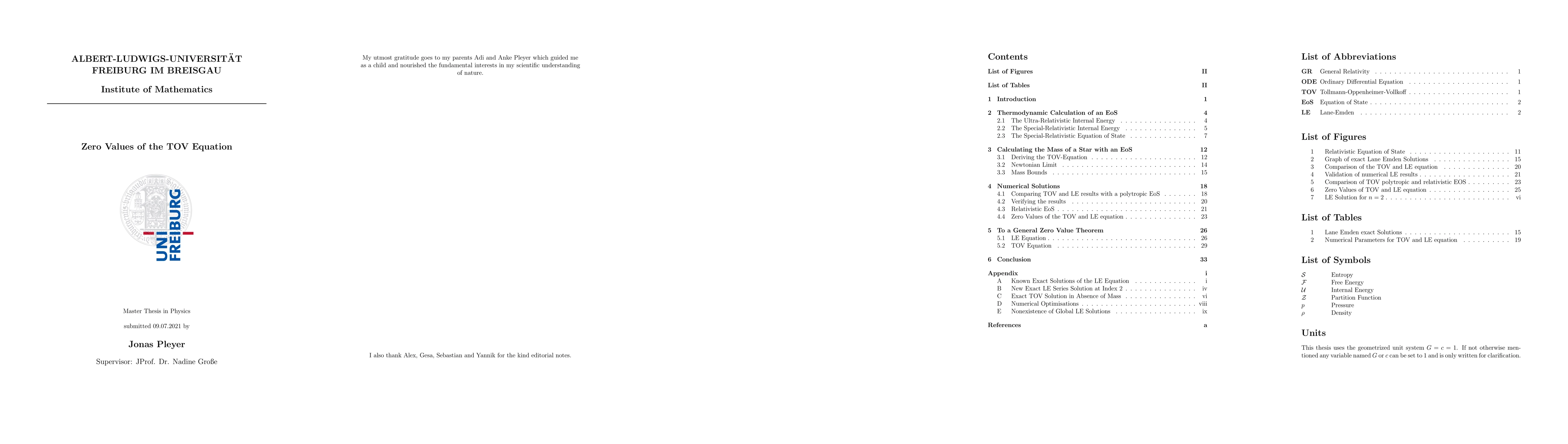 This research calculates the special-relativistic internal energy of a non-interacting gas and applies it to the TOV equation, finding that its zero values are smaller compared to the Lane-Emden equation for identical parameters. Initial developments towards proving this theorem and an additional exact solution for the Lane-Emden equation with index $n=2$ were discovered.
