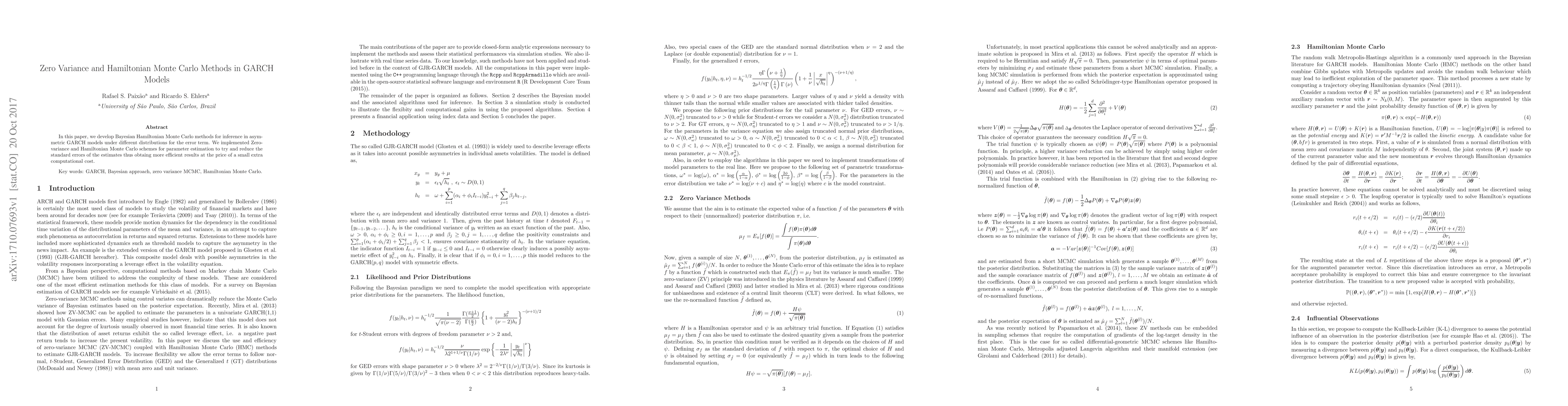 Summary: This research proposes Bayesian Hamiltonian Monte Carlo methods, including Zero-variance and Hamiltonian schemes, to improve parameter estimation in asymmetric GARCH models, aiming to achieve more efficient results with minimal extra computational expense.