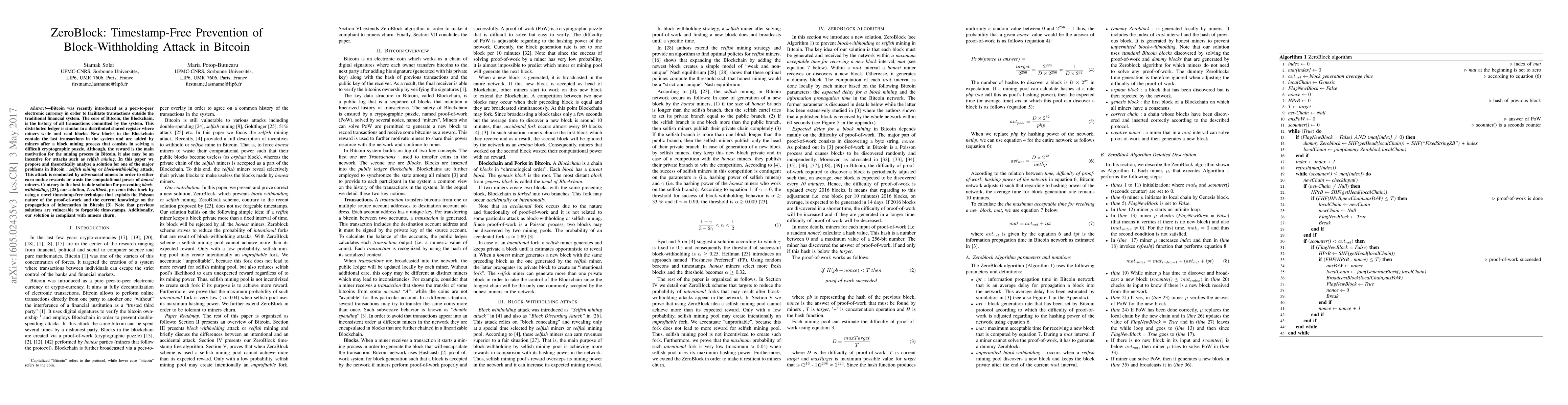 ZeroBlock proposes a novel timestamp-free method to prevent block-withholding attacks in Bitcoin, addressing the selfish mining issue without relying on easily forged timestamps, and ensuring compatibility with network node churn.