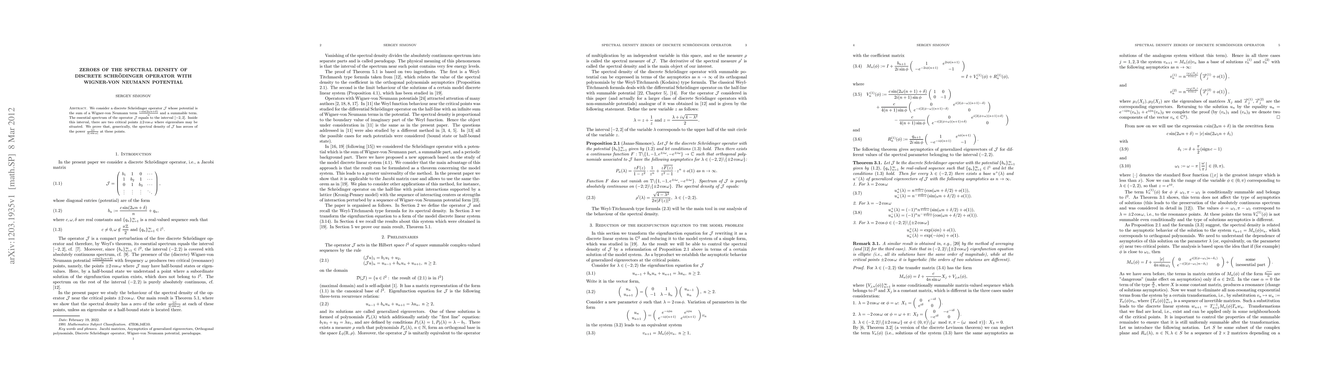 Summary: This paper investigates a discrete Schrödinger operator with a Wigner-von Neumann potential, proving that the spectral density generically has zeroes of the power type at two critical points within the interval [-2,2] of the essential spectrum.