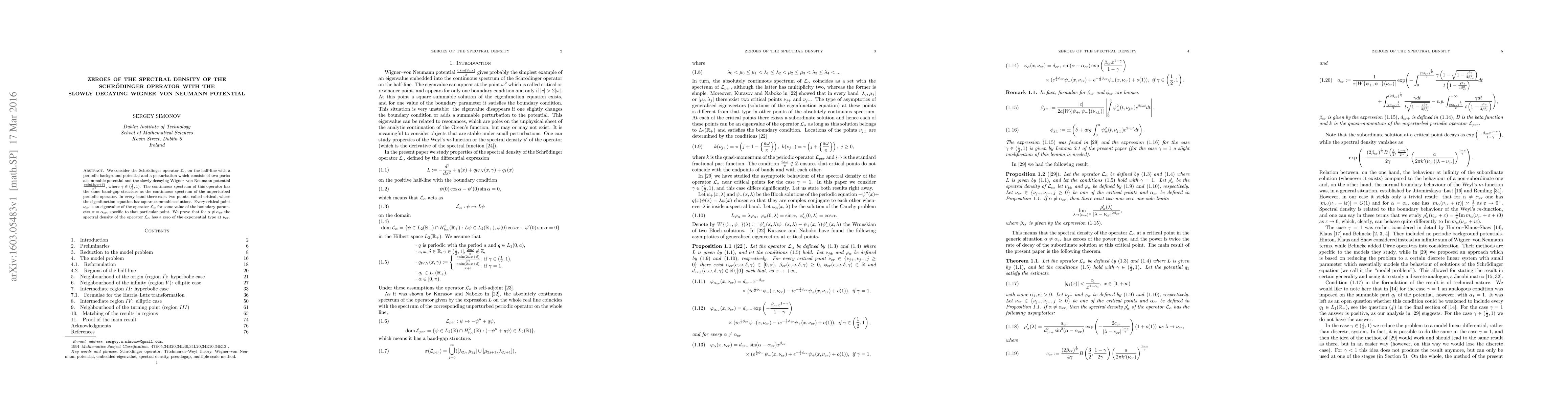 This paper investigates the zeroes of the spectral density of a Schrödinger operator with a periodic background and a perturbation that includes a slowly decaying Wigner-von Neumann potential. It demonstrates that critical points in the continuous spectrum correspond to eigenvalues and that the spectral density has exponential zeroes away from these critical points.