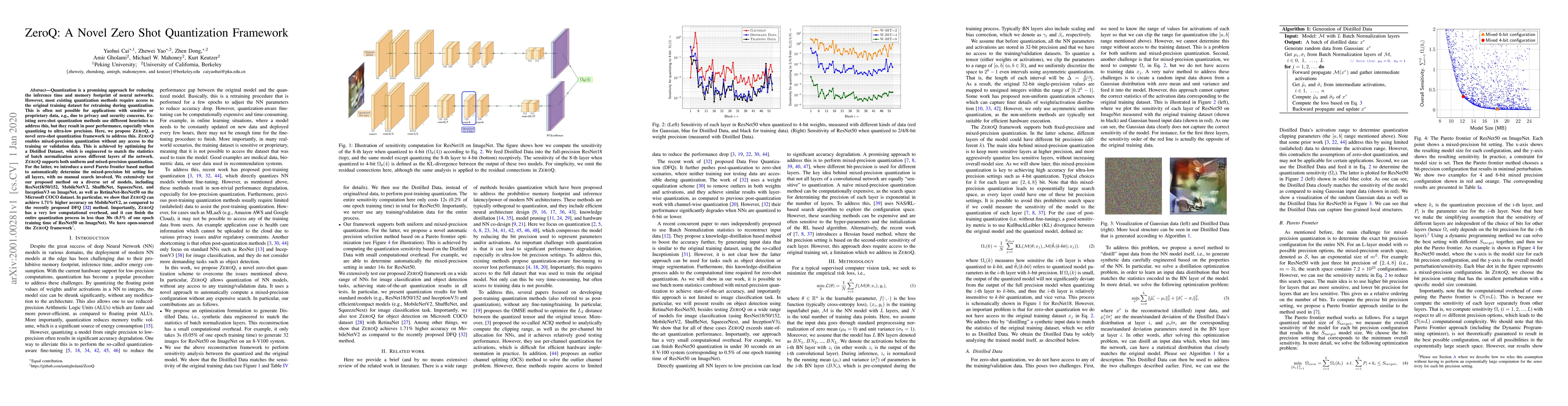 Quantization is a promising approach for reducing the inference time and memory footprint of neural networks. However, most existing quantization methods require access to the original training dataset for retraining during quantization. This is often not possible for applications with sensitive or proprietary data, e.g., due to privacy and security concerns. Existing zero-shot quantization methods use different heuristics to address this, but they result in poor performance, especially when quantizing to ultra-low precision. Here, we propose ZeroQ , a novel zero-shot quantization framework to address this. ZeroQ enables mixed-precision quantization without any access to the training or validation data. This is achieved by optimizing for a Distilled Dataset, which is engineered to match the statistics of batch normalization across different layers of the network. ZeroQ supports both uniform and mixed-precision quantization. For the latter, we introduce a novel Pareto frontier based method to automatically determine the mixed-precision bit setting for all layers, with no manual search involved. We extensively test our proposed method on a diverse set of models, including ResNet18/50/152, MobileNetV2, ShuffleNet, SqueezeNext, and InceptionV3 on ImageNet, as well as RetinaNet-ResNet50 on the Microsoft COCO dataset. In particular, we show that ZeroQ can achieve 1.71\% higher accuracy on MobileNetV2, as compared to the recently proposed DFQ method. Importantly, ZeroQ has a very low computational overhead, and it can finish the entire quantization process in less than 30s (0.5\% of one epoch training time of ResNet50 on ImageNet). We have open-sourced the ZeroQ framework\footnote{https://github.com/amirgholami/ZeroQ}.