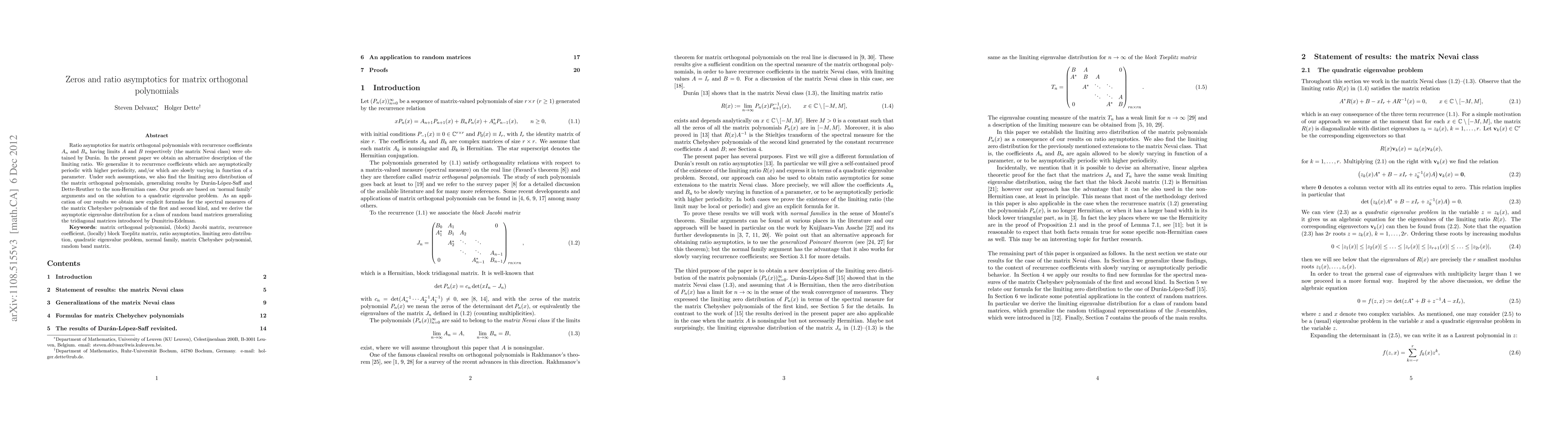 Ratio asymptotics for matrix orthogonal polynomials with recurrence coefficients $A_n$ and $B_n$ having limits $A$ and $B$ respectively (the matrix Nevai class) were obtained by Dur\'an. In the present paper we obtain an alternative description of the limiting ratio. We generalize it to recurrence coefficients which are asymptotically periodic with higher periodicity, and/or which are slowly varying in function of a parameter. Under such assumptions, we also find the limiting zero distribution of the matrix orthogonal polynomials, generalizing results by Dur\'an-L\'opez-Saff and Dette-Reuther to the non-Hermitian case. Our proofs are based on "normal family" arguments and on the solution to a quadratic eigenvalue problem. As an application of our results we obtain new explicit formulas for the spectral measures of the matrix Chebyshev polynomials of the first and second kind, and we derive the asymptotic eigenvalue distribution for a class of random band matrices generalizing the tridiagonal matrices introduced by Dumitriu-Edelman.