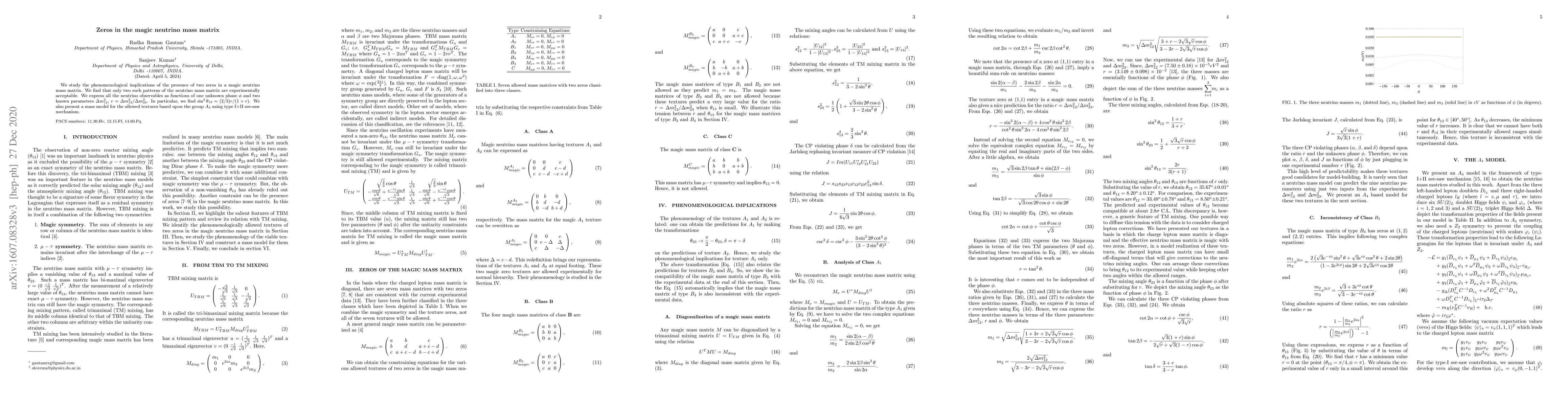 This paper investigates the implications of two zeros in a magic neutrino mass matrix, identifying two experimentally acceptable patterns. It expresses neutrino observables in terms of a single unknown phase and two known parameters, deriving $\sin^2 \theta_{13}=(2/3)r/(1+r)$, and proposes an $A_{4}$ group-based mass model for the allowed textures using type I+II see-saw mechanism.