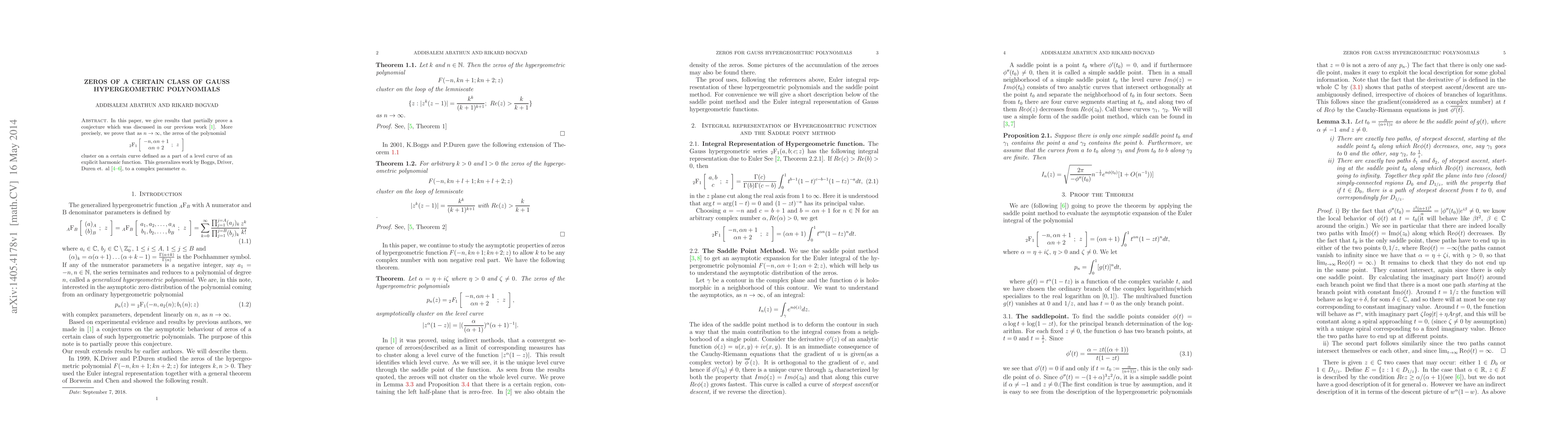 This paper proves that as n approaches infinity, the zeros of a specific Gauss hypergeometric polynomial cluster on a curve defined by an explicit harmonic function, extending previous work to complex parameter α.