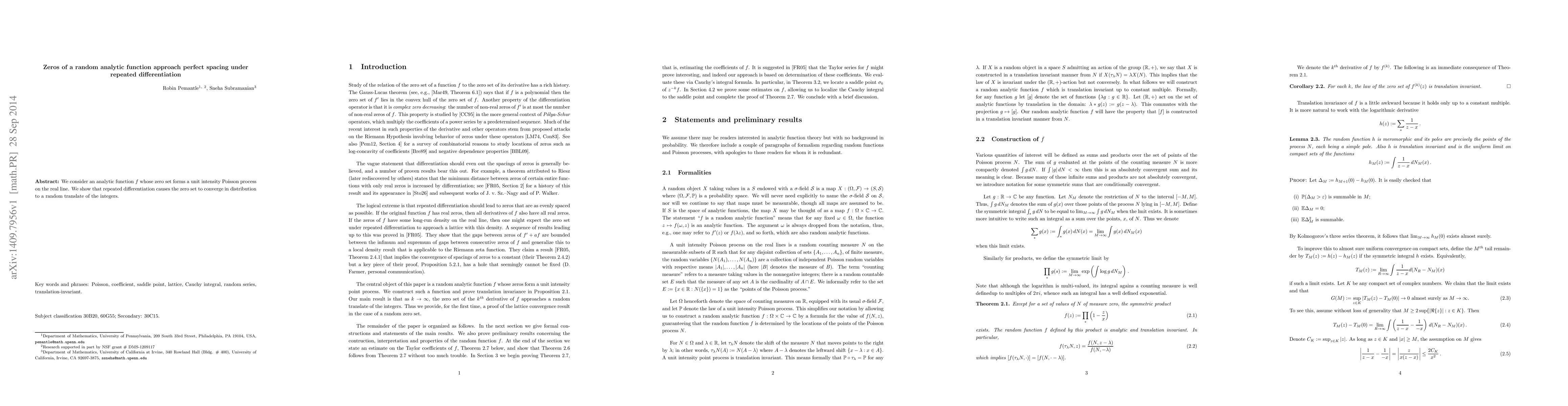 Summary: This paper investigates an analytic function with zeros distributed according to a unit intensity Poisson process. It demonstrates that repeated differentiation leads the zero set to converge in distribution to a random translation of the integer lattice.