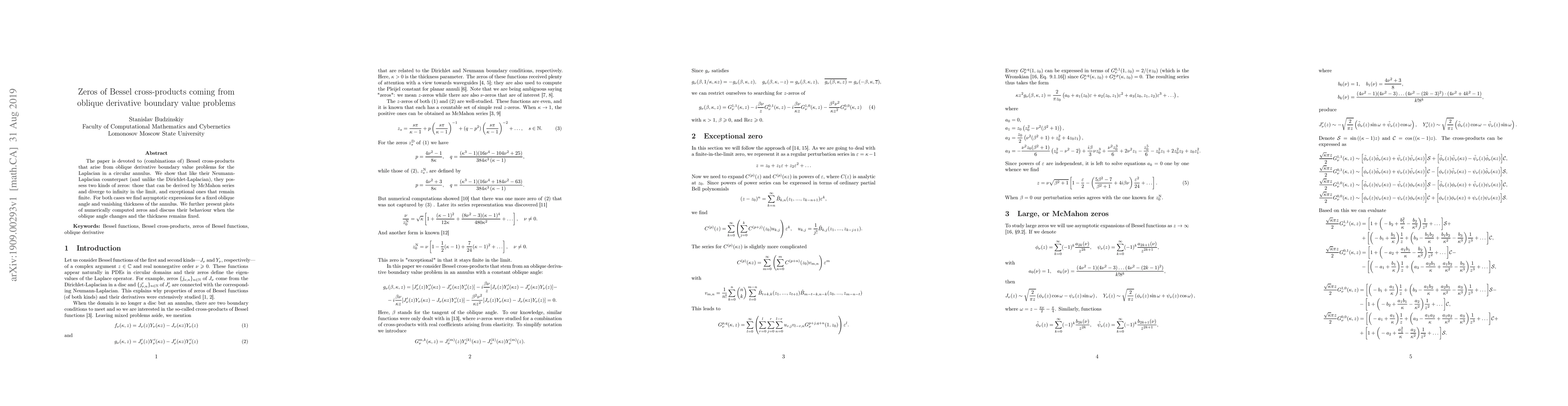 This paper finds that Bessel cross-products from oblique derivative boundary value problems for the Laplacian have two types of zeros: those diverging to infinity and exceptional ones remaining finite, with asymptotic expressions found as the angle and thickness approach specific values.