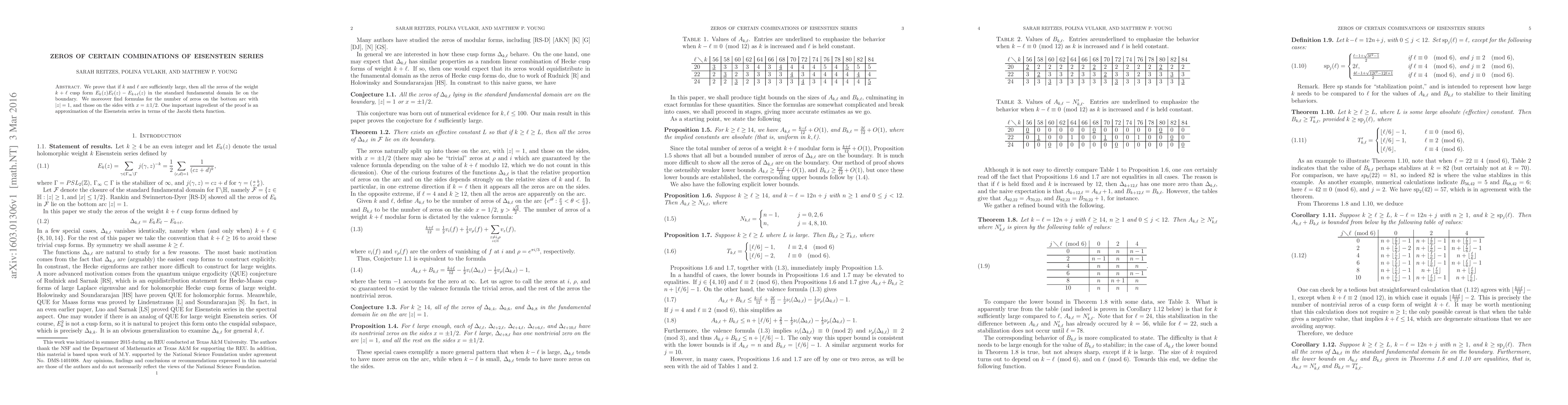 We prove that if $k$ and $\ell$ are sufficiently large, then all the zeros of the weight $k+\ell$ cusp form $E_k(z) E_{\ell}(z) - E_{k+\ell}(z)$ in the standard fundamental domain lie on the boundary. We moreover find formulas for the number of zeros on the bottom arc with $|z|=1$, and those on the sides with $x = \pm 1/2$. One important ingredient of the proof is an approximation of the Eisenstein series in terms of the Jacobi theta function.