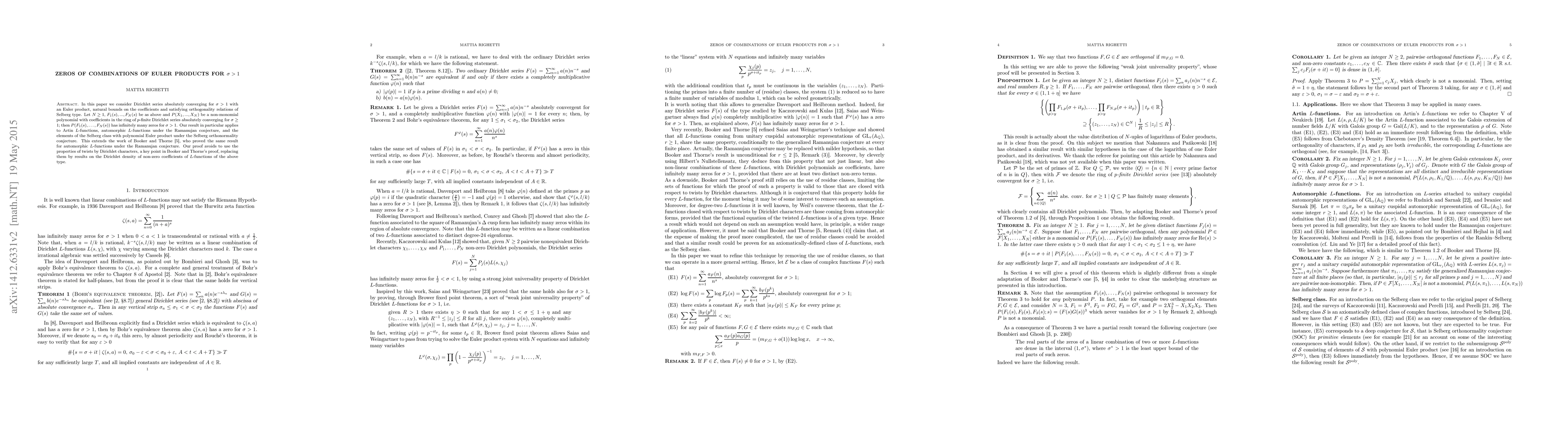 In this paper we consider Dirichlet series absolutely converging for $\sigma>1$ with an Euler product, natural bounds on the coefficients and satisfying orthogonality relations of Selberg type. Let $N\geq 1$, $F_1(s),...,F_N(s)$ be as above and $P(X_1,...,X_N)$ be a non-monomial polynomial with coefficients in the ring of $p$-finite Dirichlet series absolutely converging for $\sigma\geq 1$; then $P(F_1(s),\ldots,F_N(s))$ has infinitely many zeros for $\sigma>1$. Our result in particular applies to Artin $L$-functions, automorphic $L$-functions under the Ramanujan conjecture, and the elements of the Selberg class with polynomial Euler product under the Selberg orthonormality conjecture. This extends the work of Booker and Thorne, who proved the same result for automorphic $L$-functions under the Ramanujan conjecture. Our proof avoids to use the properties of twists by Dirichlet characters, a key point in Booker and Thorne's proof, replacing them by results on the Dirichlet density of non-zero coefficients of $L$-functions of the above type.