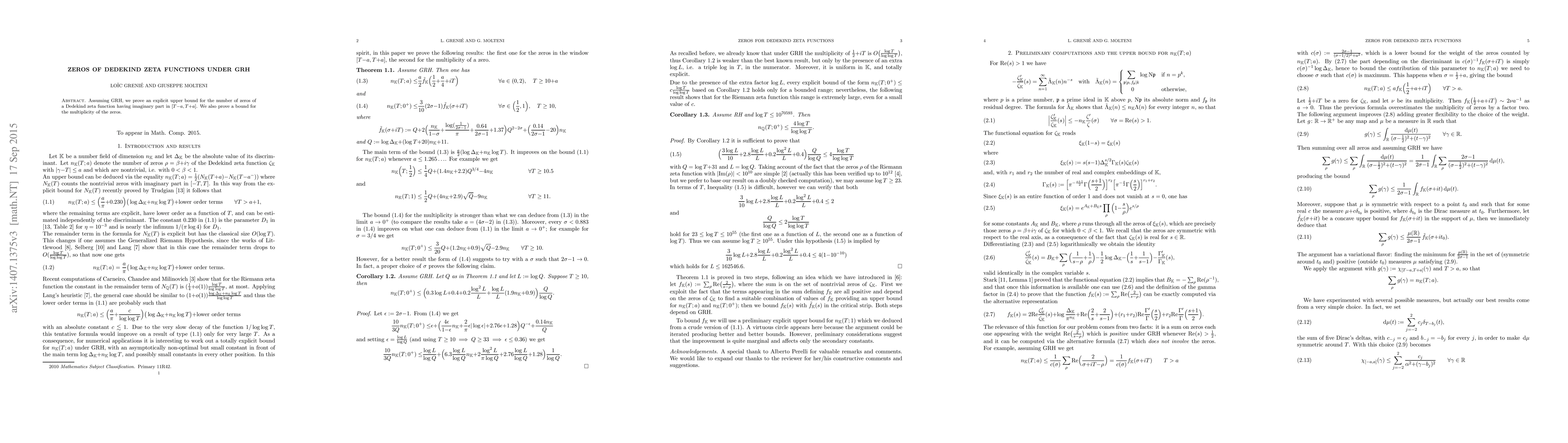 This paper proves an upper bound for the number of zeros of Dedekind zeta functions with imaginary part in a given range under the Generalized Riemann Hypothesis (GRH), as well as a bound for their multiplicity.