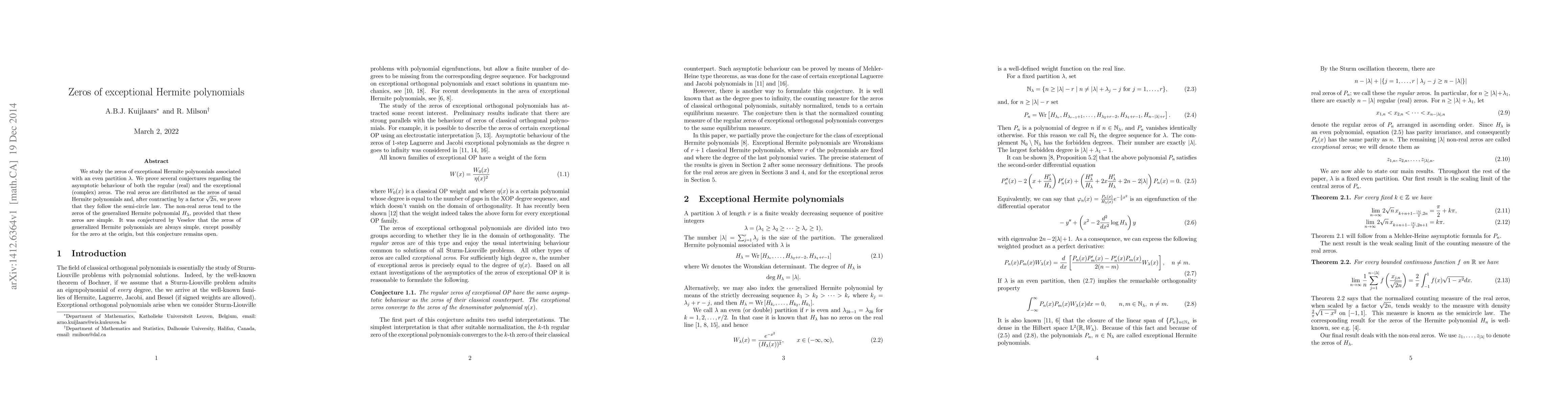 This paper investigates the zeros of exceptional Hermite polynomials linked to even partitions, proving conjectures about their asymptotic behavior. Real zeros exhibit a semi-circle law after scaling, while non-real zeros converge to those of a generalized Hermite polynomial, assuming the latter's zeros are simple.