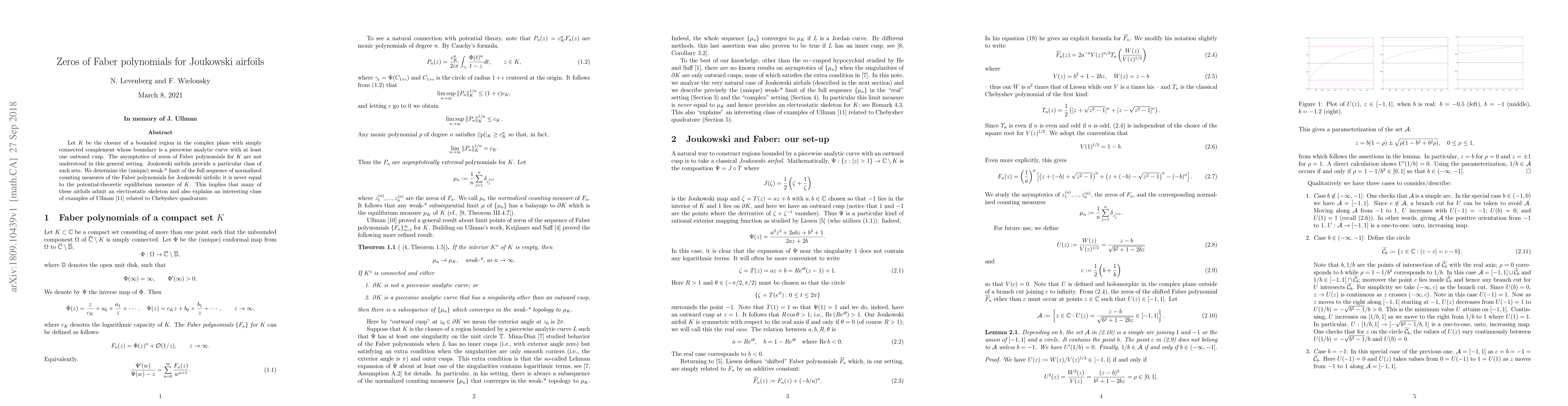 This paper investigates the asymptotic behavior of Faber polynomials for Joukowski airfoils, revealing that their zeros converge to a unique weak-* limit distinct from the equilibrium measure. This finding highlights the presence of an electrostatic skeleton in many airfoils and connects to Ullman's work on Chebyshev quadrature.