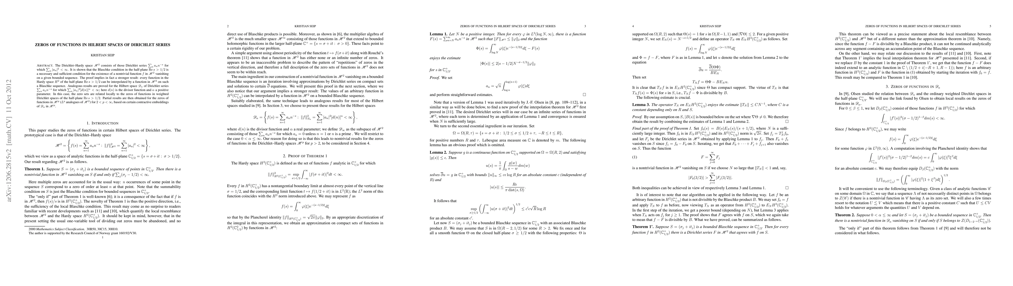 This paper explores the zeros of Dirichlet series in various Hilbert spaces, demonstrating that the Blaschke condition is necessary and sufficient for nontrivial functions in the Dirichlet-Hardy space $\Ht$ to vanish on a given bounded sequence. It also proves that every function in the Hardy space $H^2$ can be interpolated by a function in $\Ht$ on such a Blaschke sequence, extending similar results to weighted Dirichlet spaces and $L^p$ analogues.