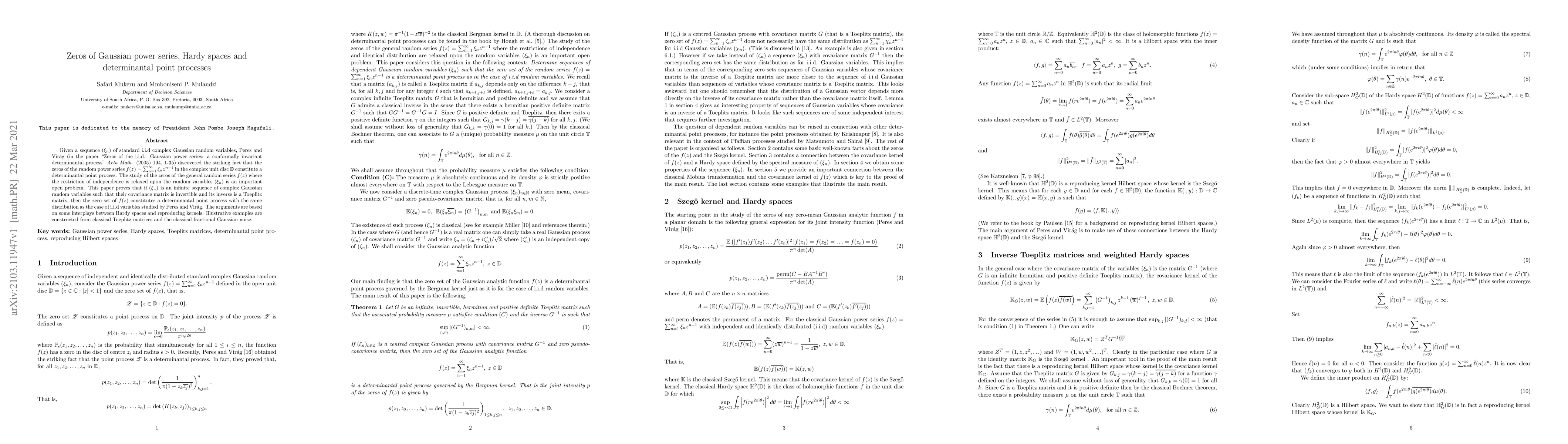 This paper extends the study of the zeros of Gaussian power series to sequences of Gaussian random variables with a Toeplitz covariance matrix, proving they form a determinantal point process, similar to the i.i.d. case. The findings are grounded in the interplay between Hardy spaces and reproducing kernels.