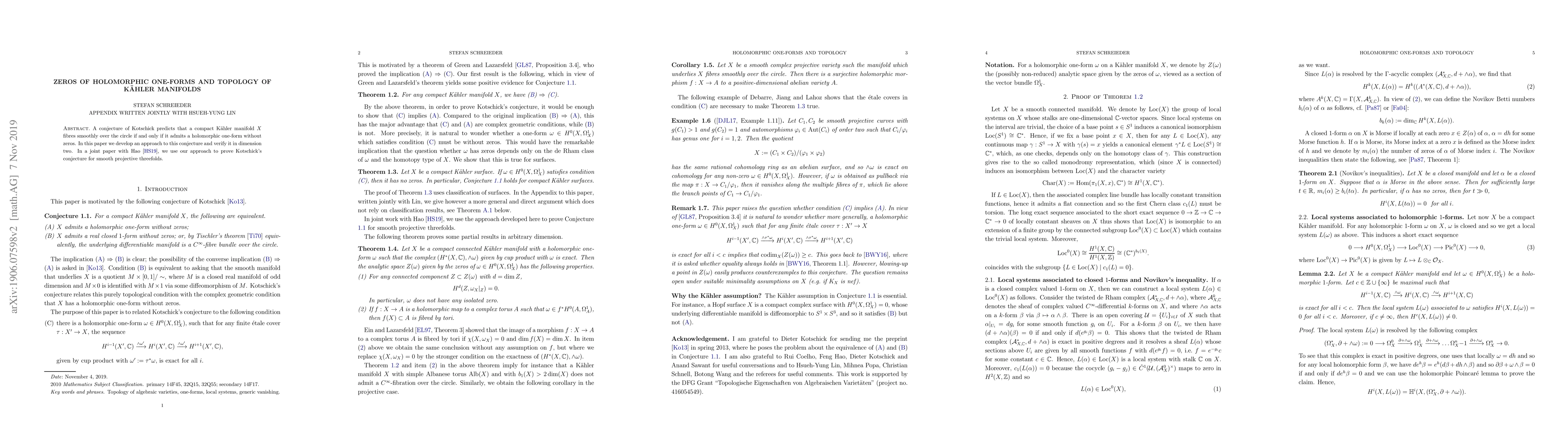 A conjecture of Kotschick predicts that a compact K\"ahler manifold $X$ fibres smoothly over the circle if and only if it admits a holomorphic one-form without zeros. In this paper we develop an approach to this conjecture and verify it in dimension two. In a joint paper with Hao, we use our approach to prove Kotschick's conjecture for smooth projective threefolds.