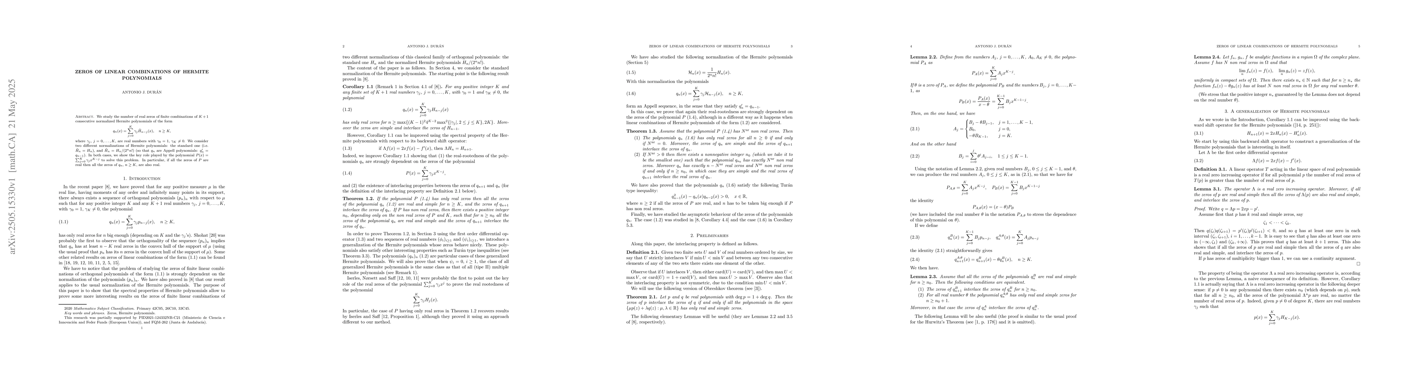 The paper establishes a connection between the zeros of linear combinations of Hermite polynomials and a companion polynomial P(x), providing conditions under which all zeros remain real.