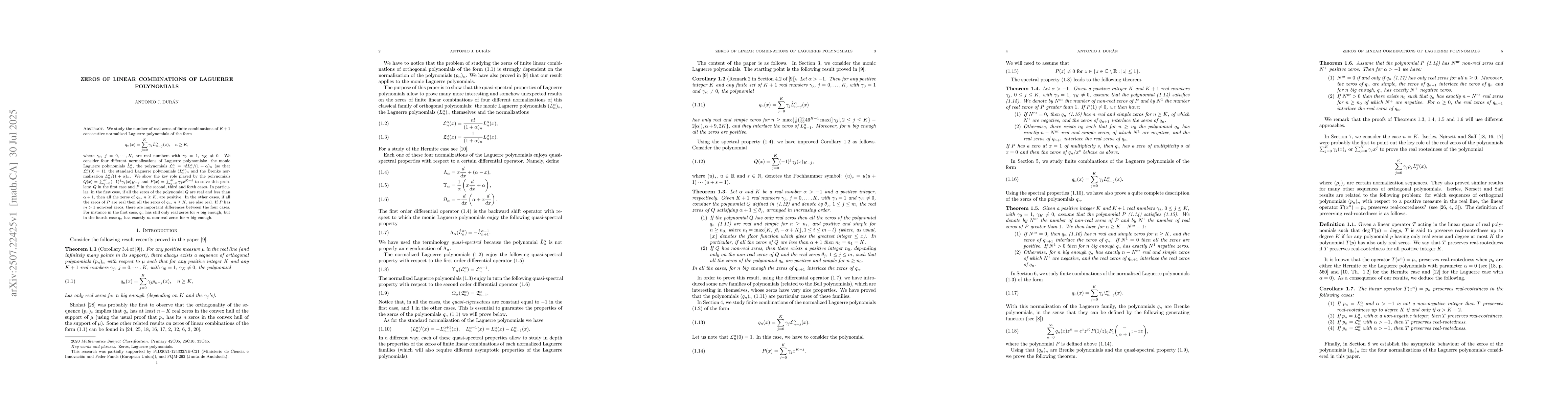 The paper presents a detailed analysis of the zeros of linear combinations of Laguerre polynomials, providing conditions for their real and simple nature under different normalizations.