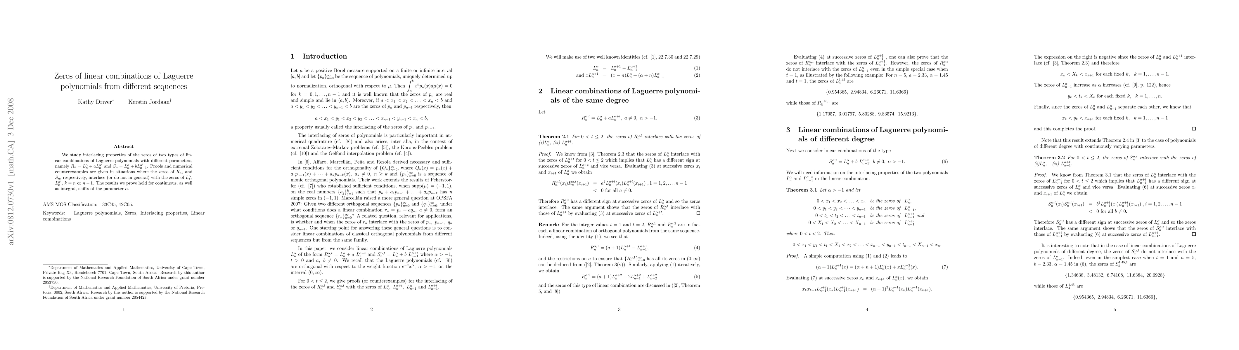 This paper investigates interlacing properties of zeros for specific linear combinations of Laguerre polynomials with different parameters, exploring their implications on the placement of zeros in relation to other polynomials.