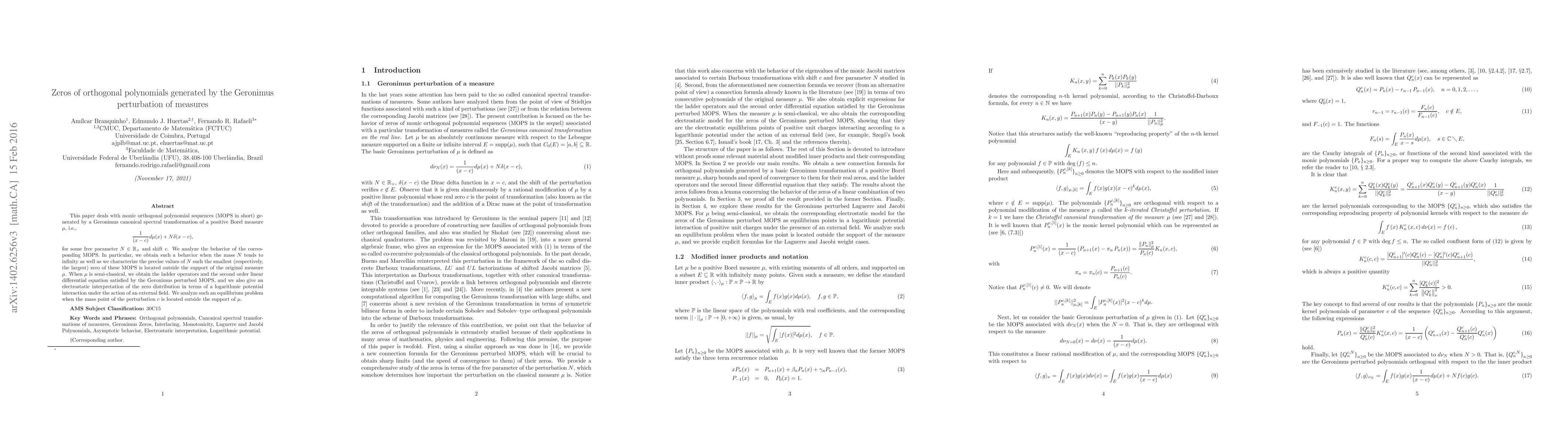 This paper deals with monic orthogonal polynomial sequences (MOPS in short) generated by a Geronimus canonical spectral transformation of a positive Borel measure $\mu$, i.e., \begin{equation*} \frac{1}{(x-c)}d\mu (x)+N\delta (x-c), \end{equation*} for some free parameter $N \in \mathbb{R}_{+}$ and shift $c$. We analyze the behavior of the corresponding MOPS. In particular, we obtain such a behavior when the mass $N$ tends to infinity as well as we characterize the precise values of $N$ such the smallest (respectively, the largest) zero of these MOPS is located outside the support of the original measure $\mu$. When $\mu$ is semi-classical, we obtain the ladder operators and the second order linear differential equation satisfied by the Geronimus perturbed MOPS, and we also give an electrostatic interpretation of the zero distribution in terms of a logarithmic potential interaction under the action of an external field. We analyze such an equilibrium problem when the mass point of the perturbation $c$ is located outside of the support of $\mu$.