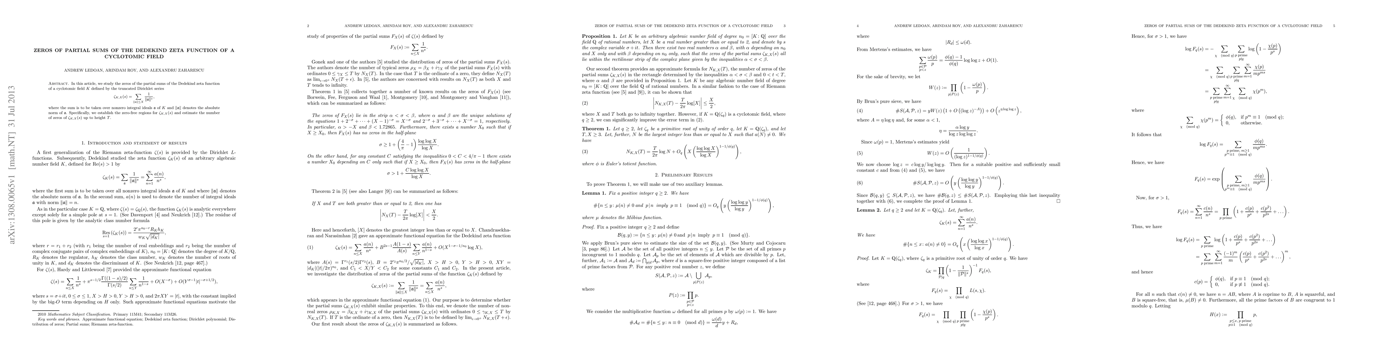 This paper investigates the zeros of partial sums of the Dedekind zeta function for cyclotomic fields, establishing zero-free regions and estimating the number of zeros up to a given height. The focus is on the truncated Dirichlet series defined by the sum over nonzero integral ideals.