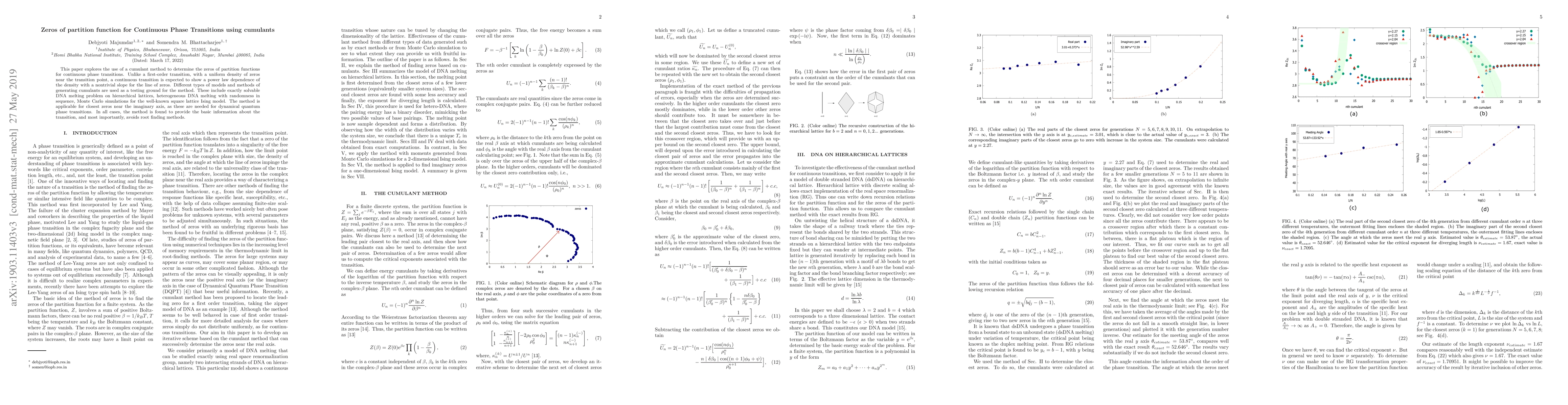 This paper employs cumulant methods to identify zeros of partition functions in continuous phase transitions, revealing a power law density of zeros distinct from first-order transitions. The method is tested on various models, including DNA melting and the Ising model, and avoids traditional root-finding techniques.