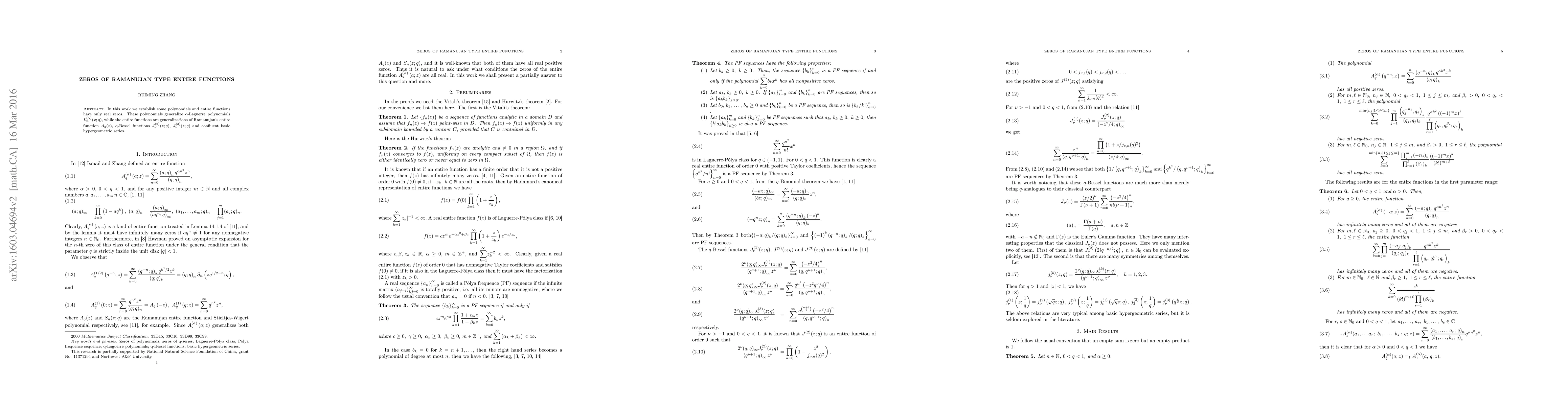 This paper establishes that certain generalized polynomials and entire functions, including q-Laguerre polynomials and q-Bessel functions, possess only real zeros. It extends the properties of Ramanujan's entire function and confluent basic hypergeometric series.